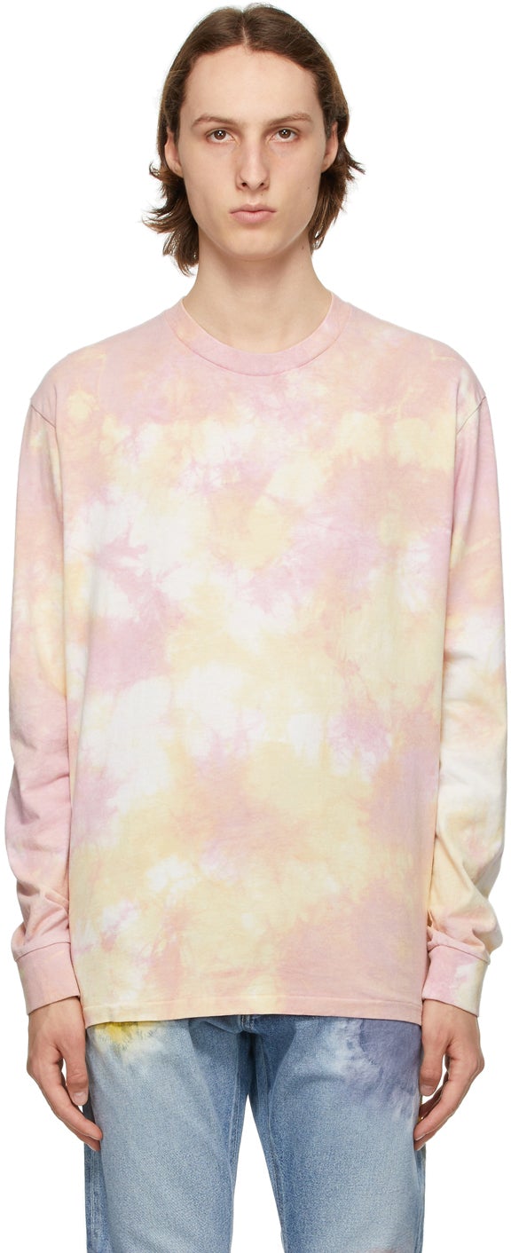 Long sleeve cotton jersey T-shirt in pink featuring tie-dye pattern in tones of yellow and white throughout. Rib knit crewneck collar and cuffs. Each item is unique. Please note that coloration may vary. Supplier color: Super bloom 100% cotton. Brand: John Elliott