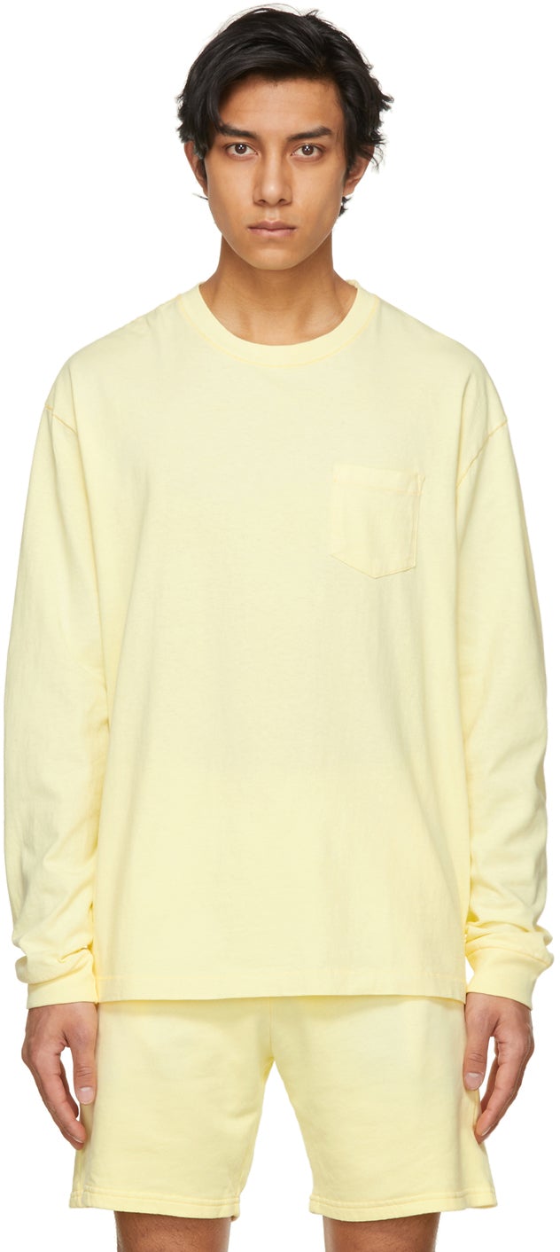Long sleeve cotton jersey T-shirt in yellow. Fading throughout. Rib knit crewneck collar and cuffs. Patch pocket at chest. Supplier color: Solar 100% cotton. Brand: John Elliott