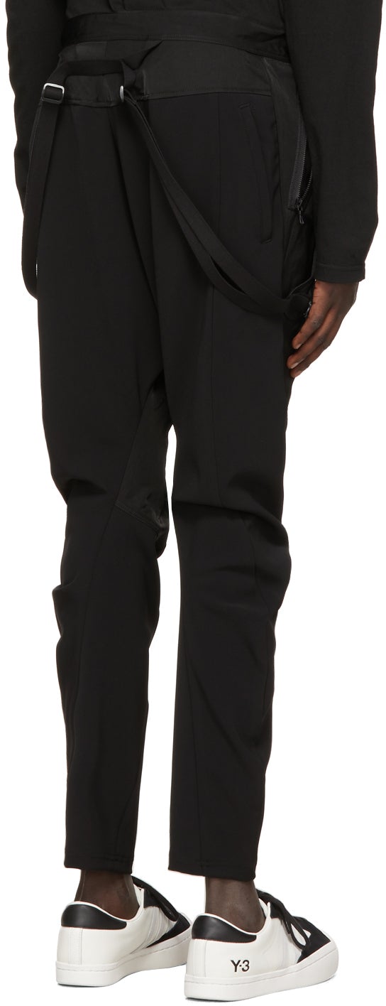 Slim-fit paneled nylon and technical jersey trousers in black. Mid-rise. Dropped inseam. Three-pocket styling. Twisted seam construction. Integrated webbing cinch belt and backpack-style strap detailing at waistband. Tonal webbing trim at front waistband. Unlined. Zip-fly. Gunmetal-tone hardware. Supplier color: Black Body 1: 100% nylon. Body 2: 89% polyester, 11% polyurethane. Brand: Julius