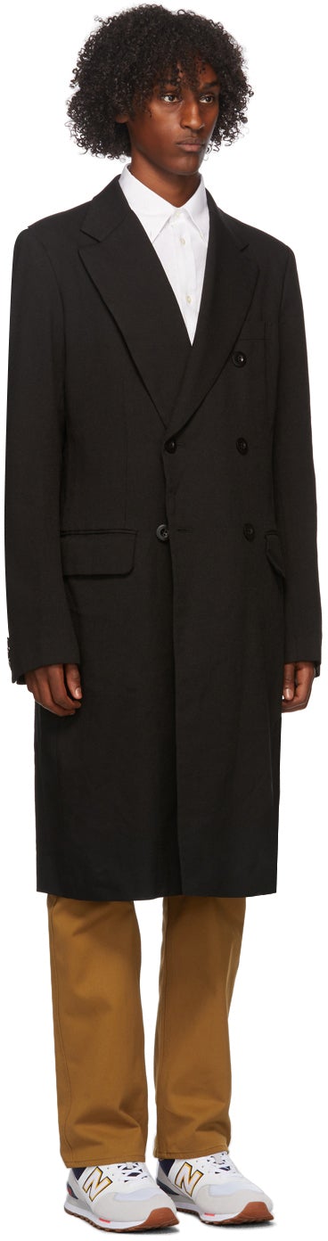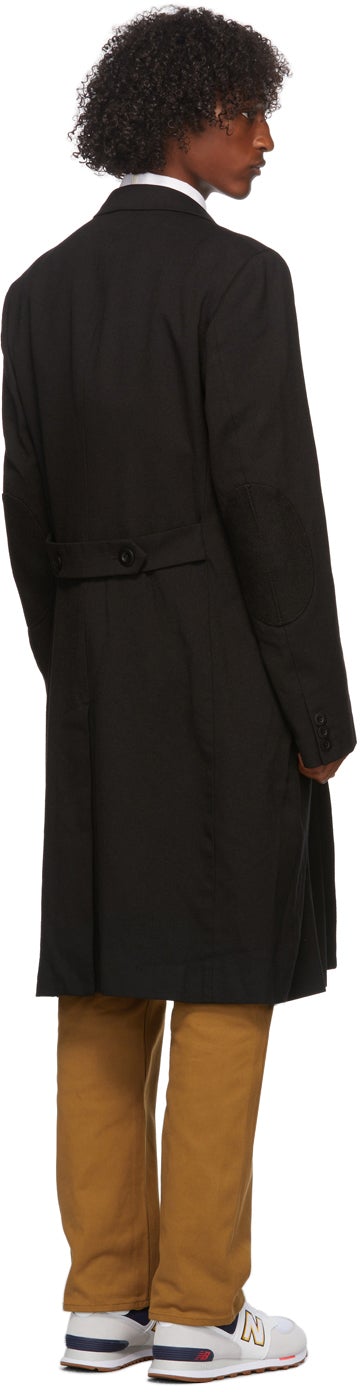Long sleeve wool-blend twill coat in black. Notched lapel collar. Double-breasted button closure at front. Welt pocket at chest. Flap pockets at waist. Three-button surgeon’s cuffs. Buttoned tab at back waist. Central vent at back hem. Welt pockets at interior. Fully lined. Tonal hardware. Supplier color: Black Body: 65% wool, 35% polyester. Lining: 100% cupro. Brand: Junya Watanabe