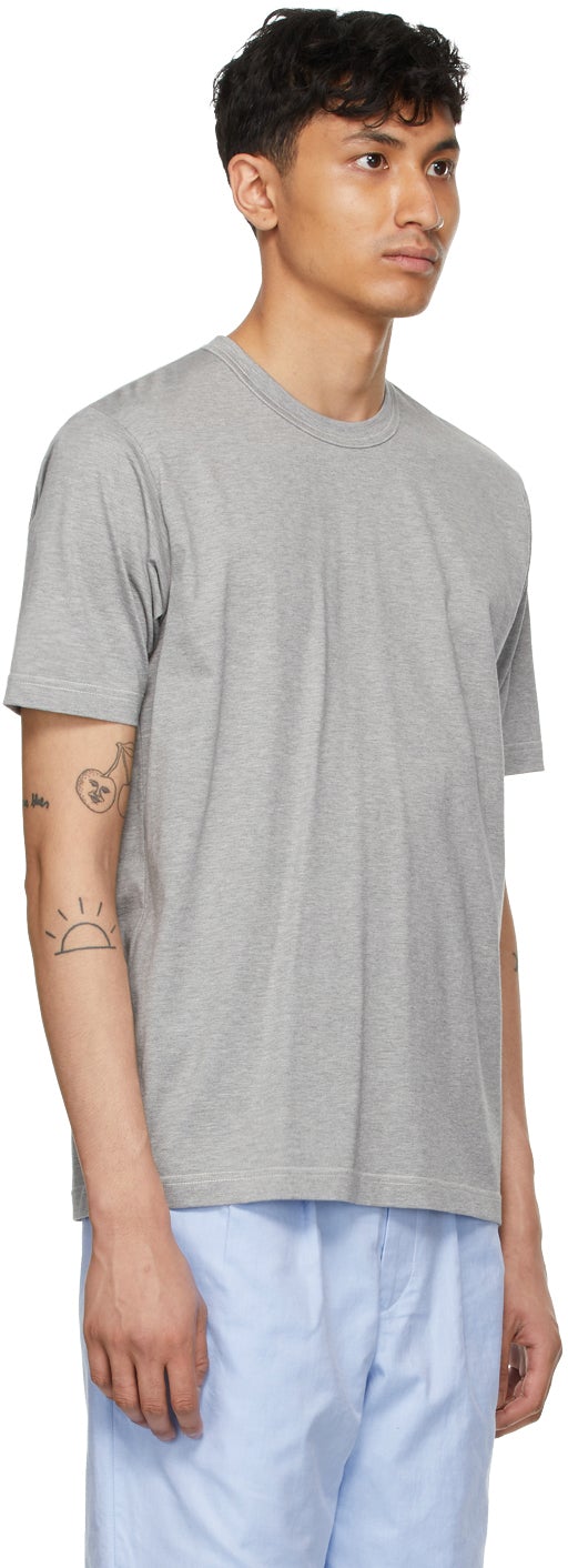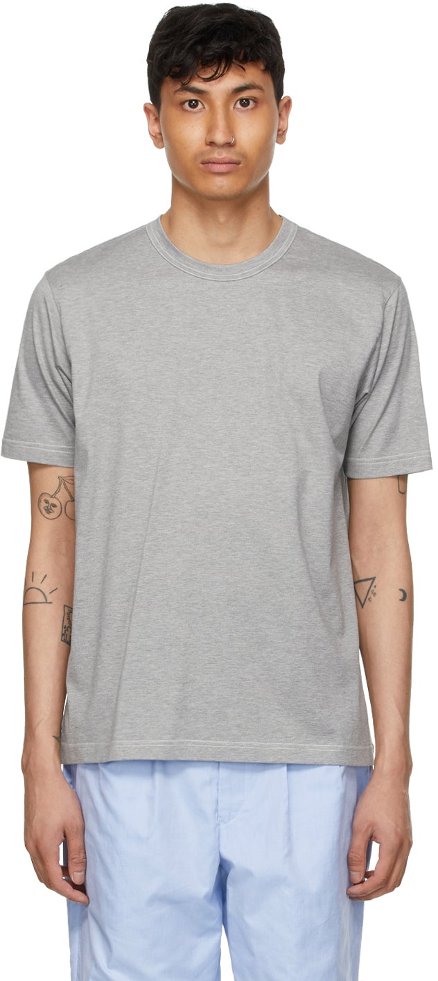 Short sleeve lightweight cotton jersey T-shirt in grey. Rib knit crewneck collar. Logo printed in navy at back collar. Contrast stitching in white. Supplier color: Top grey 100% cotton. Brand: Junya Watanabe