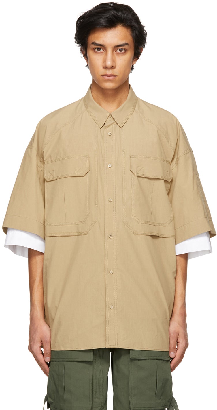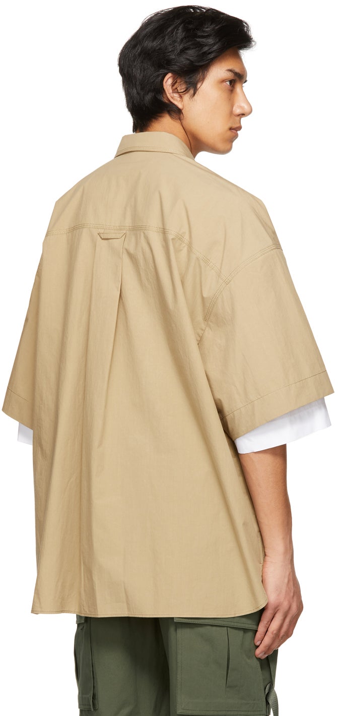 Short sleeve cotton poplin shirt in beige. Layered construction. Spread collar. Button closure at front. Flap pockets and welt pockets at chest. Welt pockets at waist. Welt pocket at sleeve. Cotton poplin trim in white at cuffs. Logo embroidered in white at cuff. Shirttail hem. Locker loop and central box pleat at back. Tonal hardware. Supplier color: Beige 100% cotton. Brand: Juun.J