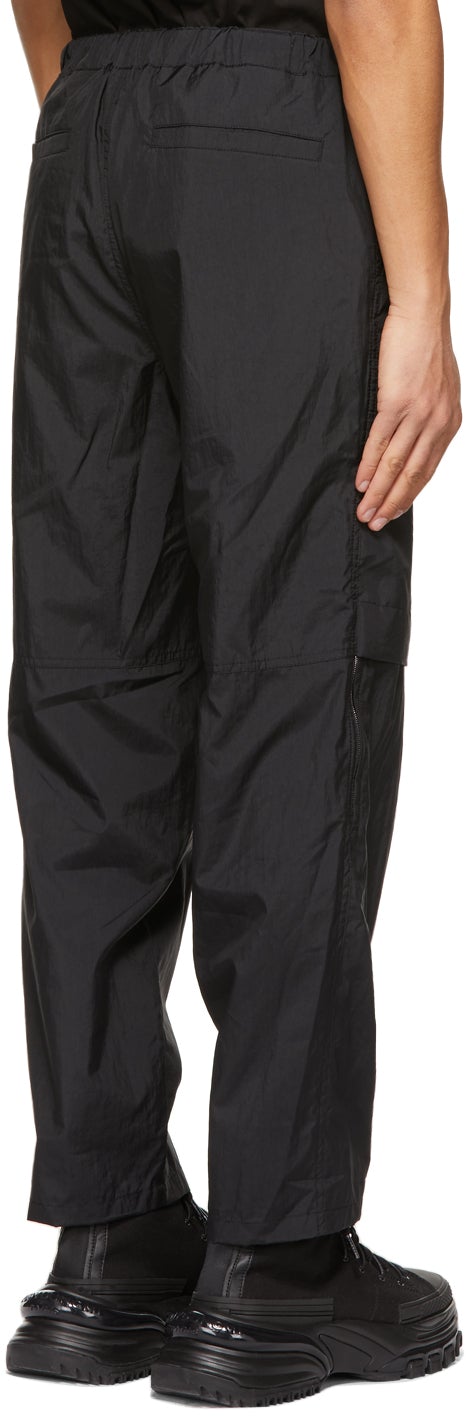 Relaxed-fit paneled nylon taffeta cargo pants in black. Mid-rise. Four-pocket styling. Tonal integrated webbing belt with cinch fastening at waistband. Flap pockets and zippered vent at front legs. Rubberized logo flag at outseam. Partial mesh lining. Zip-fly. Tonal and silver-tone hardware. Supplier color: Black Body: 100% nylon. Lining: 100% polyester. Brand: Juun.J