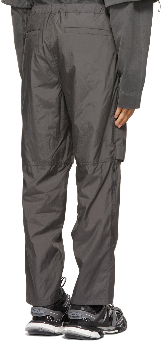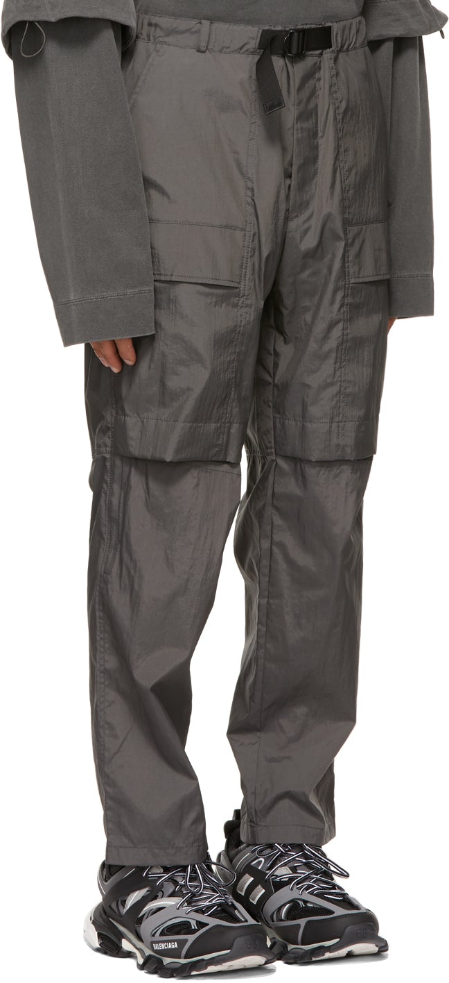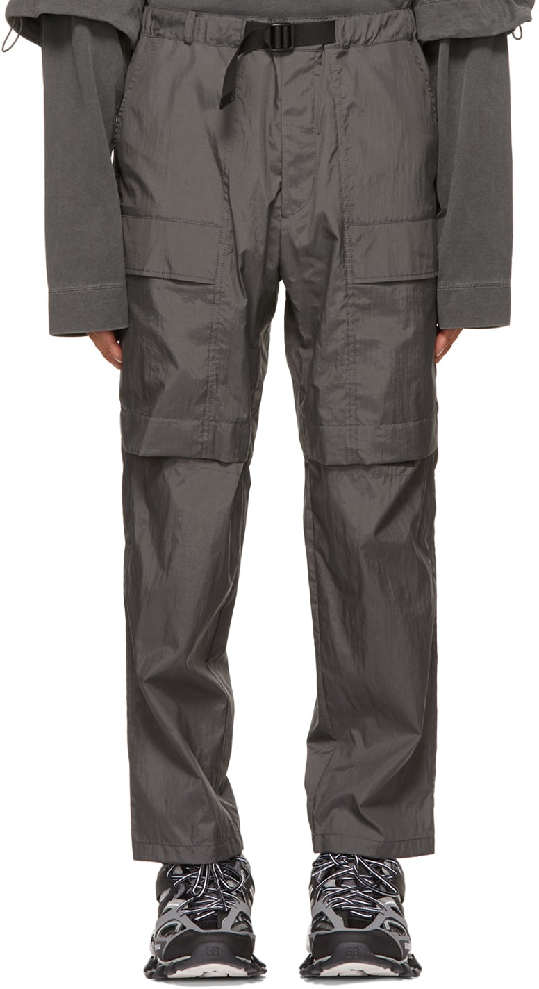 Relaxed-fit paneled nylon taffeta cargo pants in grey. Mid-rise. Four-pocket styling. Integrated webbing belt in black with cinch fastening at waistband. Flap pockets and zippered vent at front legs. Rubberized logo flag at outseam. Partial mesh lining. Zip-fly. Black and silver-tone hardware. Supplier color: Grey Body: 100% nylon. Lining: 100% polyester. Brand: Juun.J