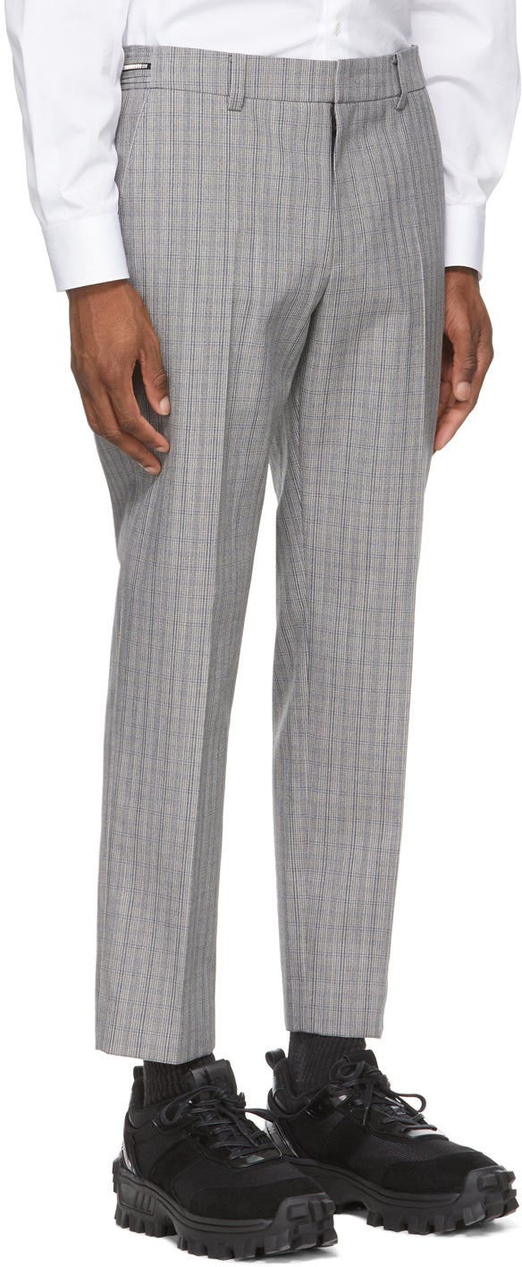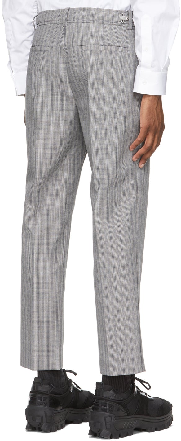 Tapered wool-blend twill trousers in grey featuring check pattern in tones of blue and beige throughout. Mid-rise. Cropped leg. Four-pocket styling. Belt loops at waistband. Zippered detailing at waistband. Pinched seams at front and back. Zip-fly. Silver-tone hardware. Supplier color: Grey 67% wool, 33% polyester. Brand: Juun.J