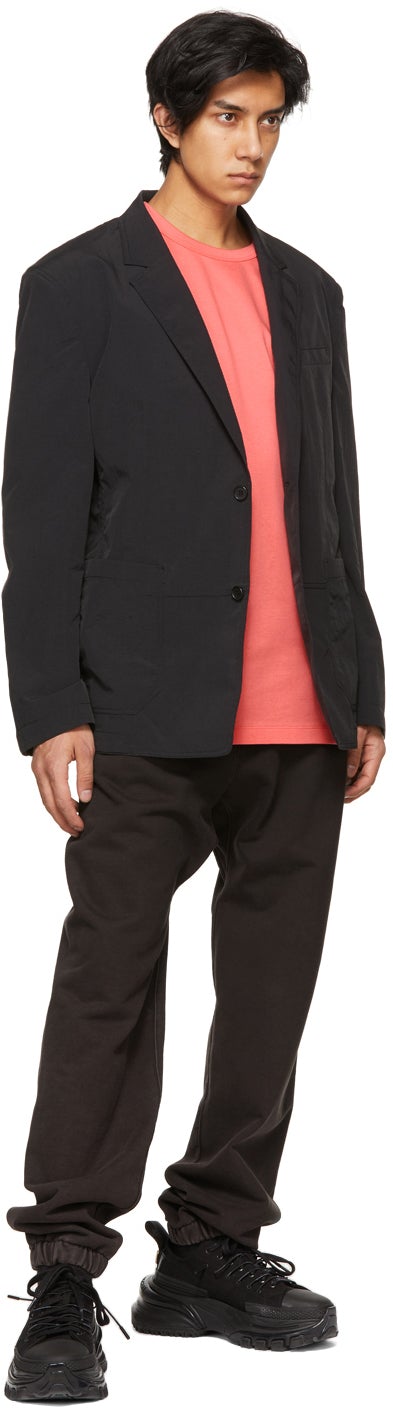 Short sleeve cotton jersey T-shirt in pink. Rib knit crewneck collar. Tonal embroidered logo at chest. Embroidered logo in black and graphic printed in tones of grey at back. Supplier color: Pink 100% cotton. Brand: Juun.J