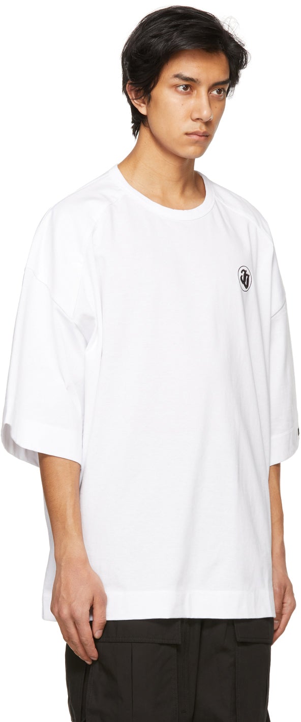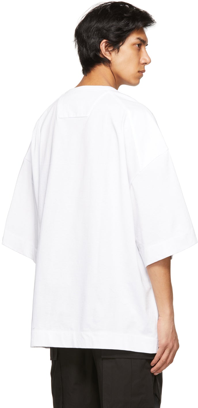 Short sleeve paneled cotton jersey T-shirt in white. Rib knit crewneck collar. Logo embroidered in black at chest and cuff. Supplier color: White 100% cotton. Brand: Juun.J