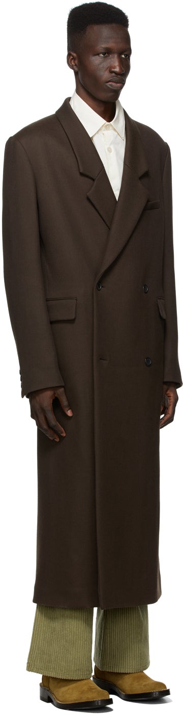 Long sleeve stretch virgin wool and cotton-blend serge coat in brown. Notched lapel collar. Double-breasted button closure at front. Welt pocket at chest. Flap pockets at waist. Padded shoulders. Three-button surgeon's cuffs. Central vent at back hem. Welt pockets at interior. Unlined. Black hardware. Supplier color: Dark brown 55% virgin wool, 44% cotton, 1% elastane. Brand: Kenzo