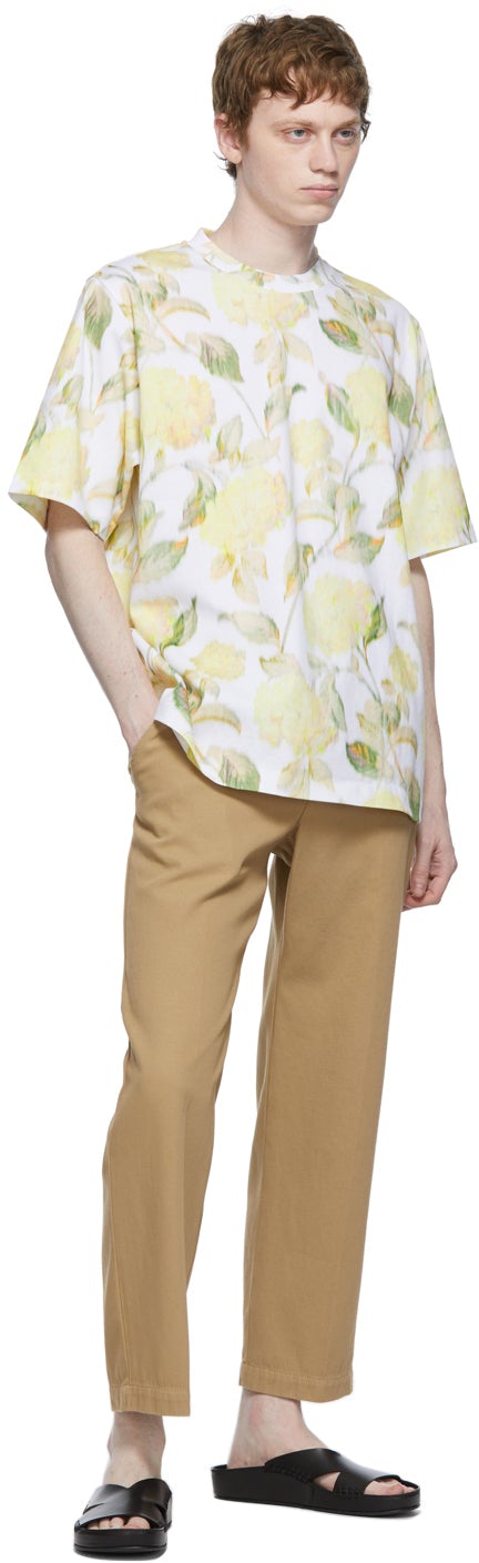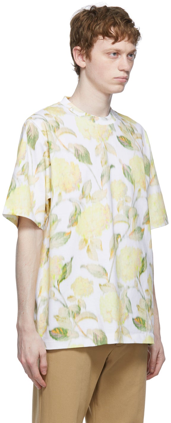 Short sleeve cotton jersey T-shirt in white featuring floral pattern printed in tones of yellow and green. Rib knit crewneck collar. Embroidered graphic patch in orange and black at back collar. Supplier color: Vanilla 100% cotton. Brand: Kenzo
