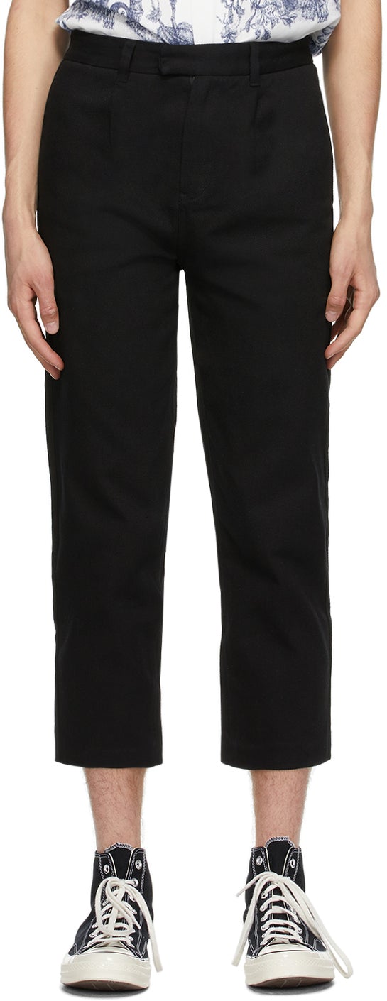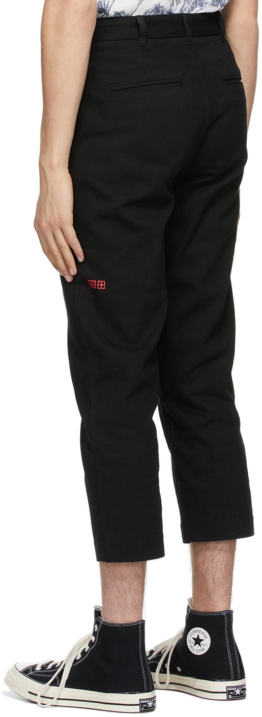 Tapered cotton twill trousers in black. Mid-rise. Four-pocket styling. Belt loops and darts at waistband. Signature embroidered graphic at back pocket. Logo printed in red at back leg. Zip-fly. Supplier color: Black 100% cotton. Brand: Ksubi