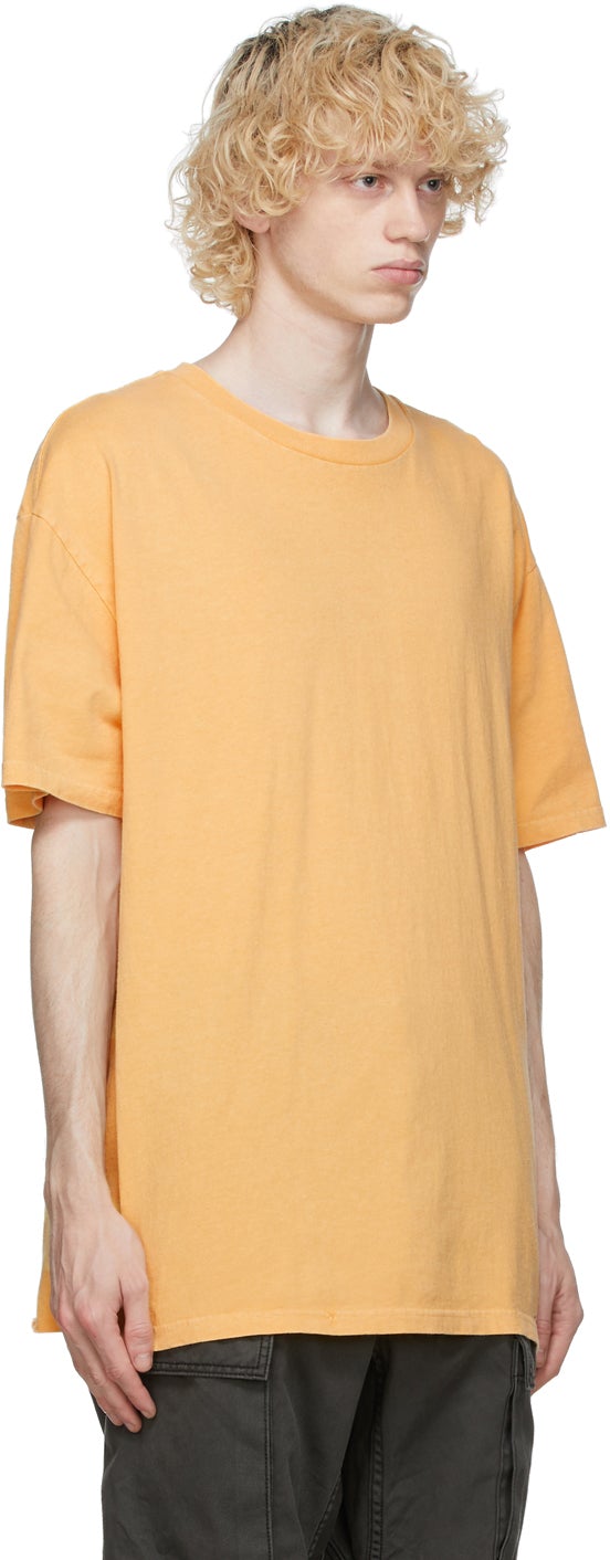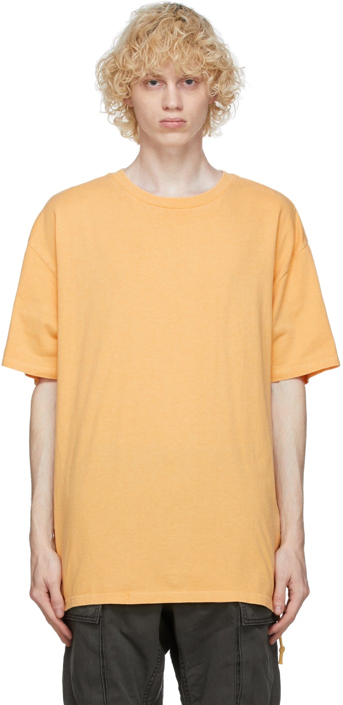 Short sleeve cotton jersey T-shirt in yellow. Rib knit crewneck collar. Raised seam at side-seam. Tonal logo printed at back hem. Extended trim at inner hem. Supplier color: Yellow 100% cotton. Brand: Ksubi