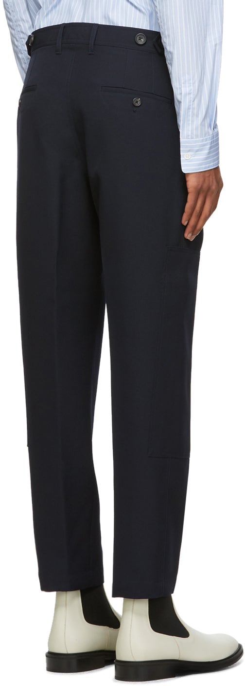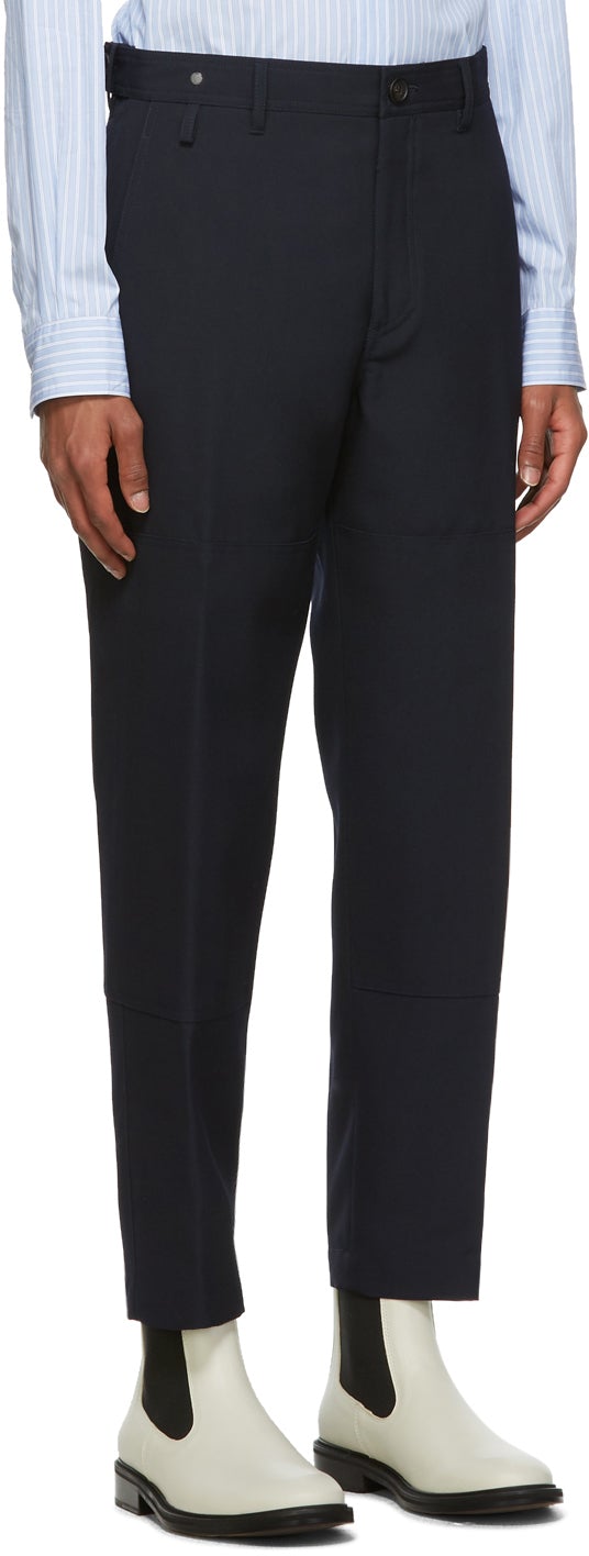 Tapered wool twill chino trousers in navy. Mid-rise. Four-pocket styling. Belt loops and adjustable buttoned tabs at waistband. Paneled detailing at legs. Unlined. Zip-fly. Black hardware. Supplier color: Dark navy 100% wool. Brand: Lanvin