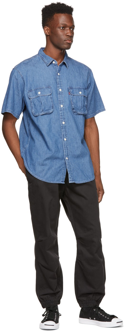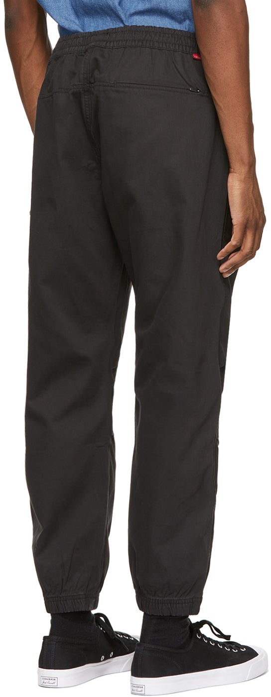 Tapered cotton and hemp-blend twill lounge pants in black. Low-rise. Fading throughout. Four-pocket styling. Concealed drawstring at elasticized waistband. Logo embroidered in grey at front. Pleats at knees. Textile logo flag in red at back waistband. Elasticized cuffs. Tonal hardware. Supplier color: Meteorite 70% cotton, 30% hemp. Brand: Levi's