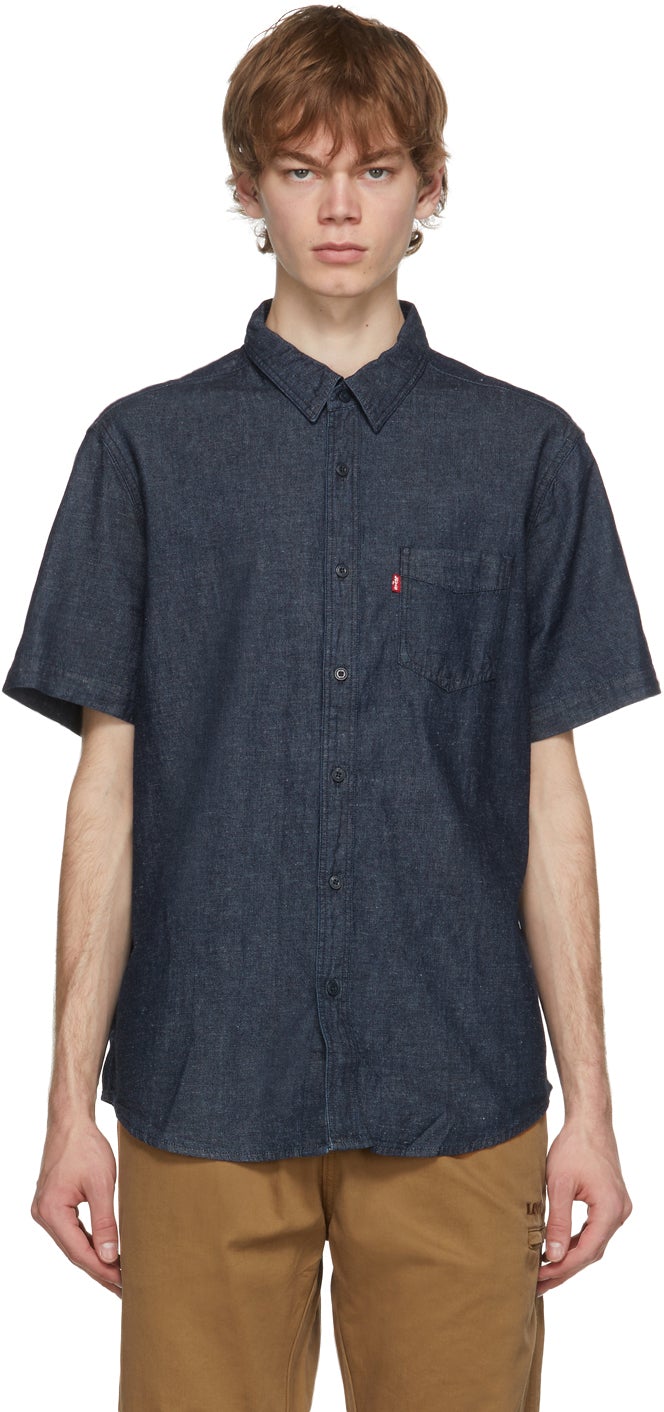 Short sleeve non-stretch hemp-blend denim shirt in indigo. Spread collar. Button closure at front. Patch pocket and textile logo flag in red at chest. Shirttail hem. Supplier color: Hemp rinse 80% cotton, 20% hemp. Brand: Levi's