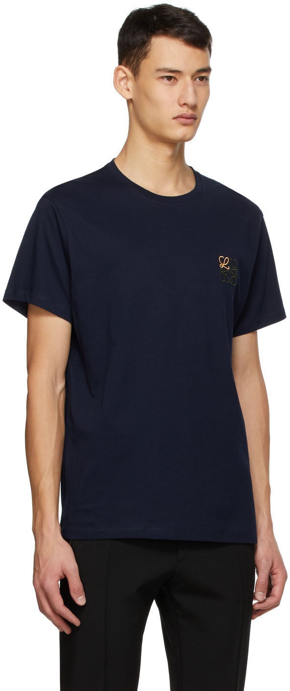 Short sleeve stretch cotton jersey T-shirt in navy. Rib knit crewneck collar. Logo embroidered in green and yellow at chest. Supplier color: Navy 95% cotton, 5% elastane. Brand: Loewe