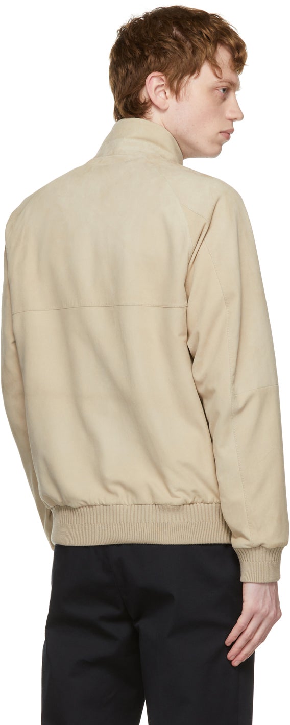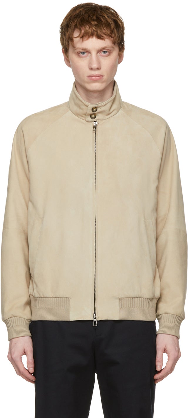 Long sleeve kidskin suede jacket in beige. Button closure at stand collar. Two-way zip closure at front. Welt pockets at waist. Raglan sleeves. Rib knit merino wool cuffs and hem. Zippered pockets at interior. Fully lined. Logo-engraved tortoiseshell and gun-metal tone hardware. Supplier color: Deserts dune Body: 100% kidskin. Trim: 100% virgin wool. Lining: 64% cotton, 36% polyester. Brand: Loro Piana