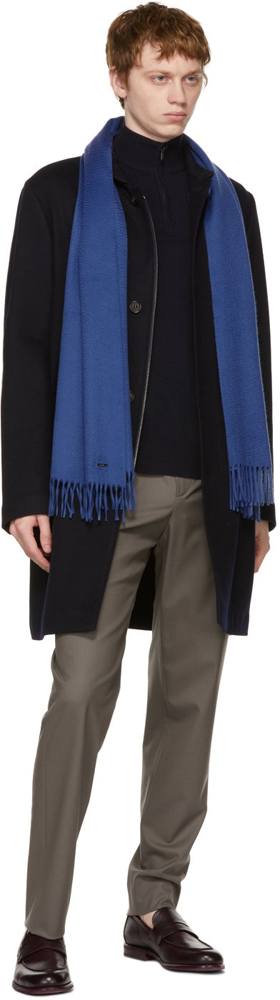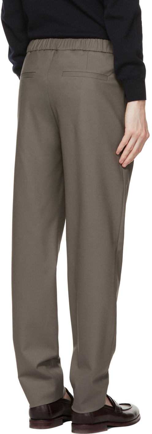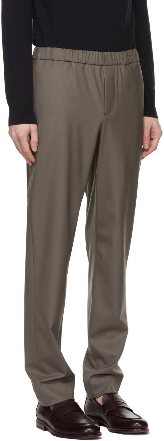Straight-leg woven stretch virgin wool trousers in grey. Mid-rise. Four-pocket styling. Elasticized waistband. Unfinished cuffs. Darts at back waistband. Viscose-blend satin lining in black. Partially lined. Zip-fly. Gunmetal-tone hardware. Supplier color: Silver myrtle Body: 97% virgin wool, 3% elastane. Lining: 60% acetate, 40% viscose. Brand: Loro Piana