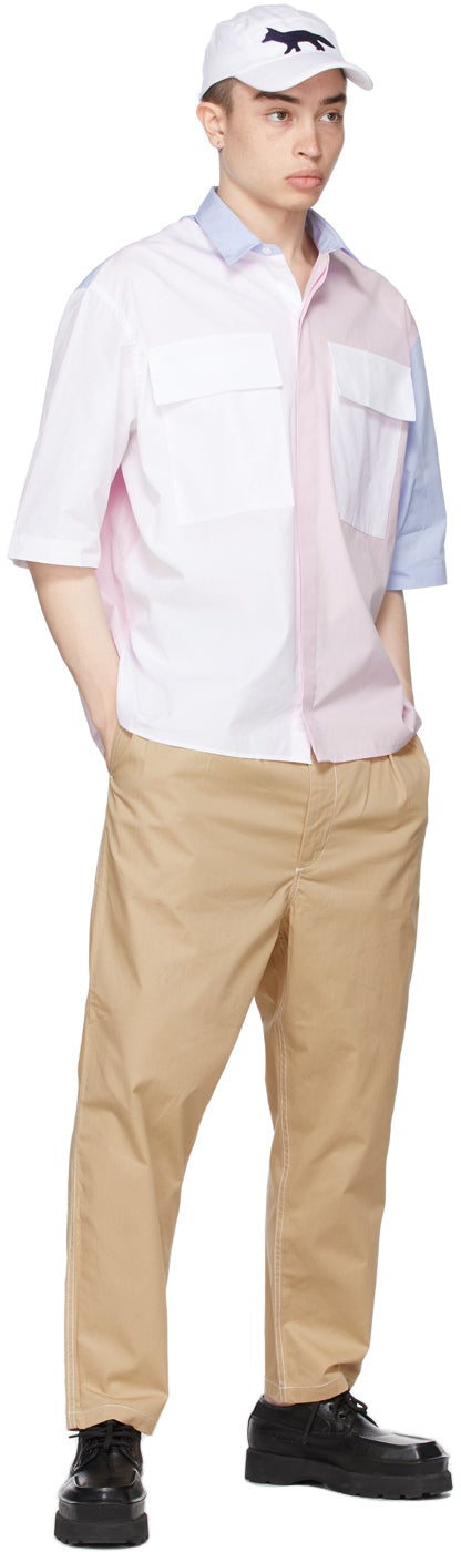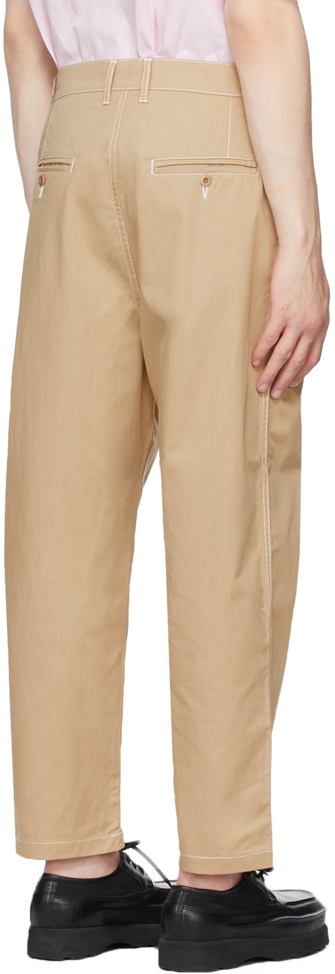 Straight-leg cotton gabardine trousers in beige. Mid-rise. Dropped inseam. Four-pocket styling. Belt loops at waistband. Pleats at front legs. Zip-fly. Tonal hardware. Contrast stitching in white. Supplier color: Beige 100% cotton. Brand: Maison Kitsuné