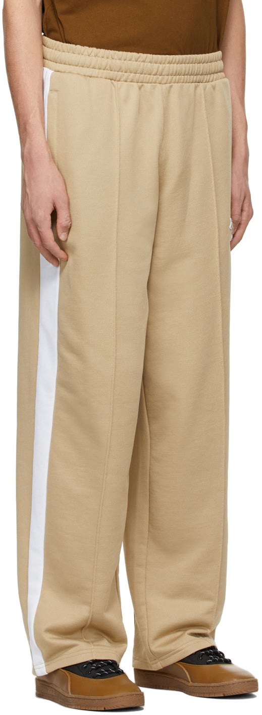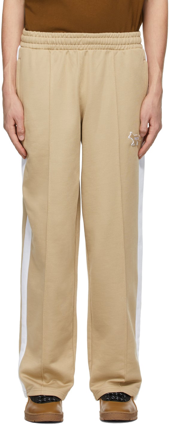 Relaxed-fit cotton-blend jersey track pants in beige. Mid-rise. Three-pocket styling. Concealed drawstring at elasticized waistband. Multicolor terrycloth logo appliqué at front leg. Pinched seam at legs. Trim in white at outseams. Tonal textile logo patch at back pocket. Part of the Maison Kitsuné x Puma collaboration. Available exclusively at SSENSE. Supplier color: Travertine Body: 58% polyester, 42% cotton. Trim: 100% cotton. Brand: Maison Kitsuné