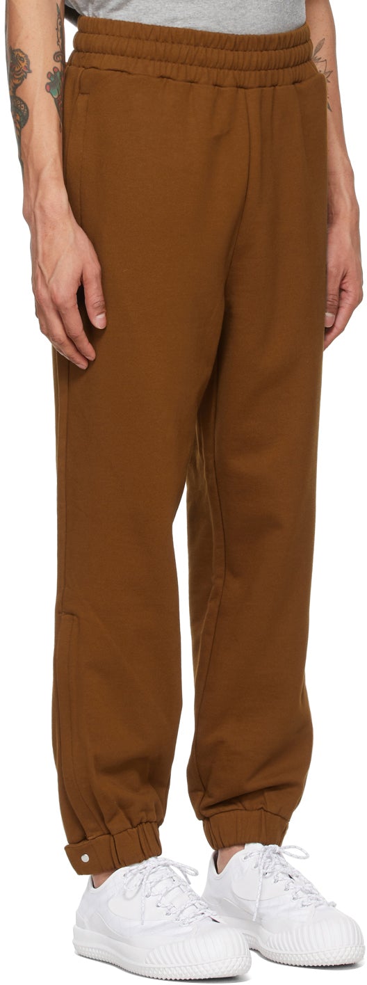 Relaxed-fit French terry lounge pants in brown. Mid-rise. Three-pocket styling. Concealed drawstring at waistband. Tonal logo patch embroidered at front leg. Zippered vent with press-stud fastening at elasticized cuffs. Tonal logo patch at back pocket. Silver-tone hardware. Part of the Maison Kitsuné x Puma collaboration. Available exclusively at SSENSE. Supplier color: Monk's robe 100% cotton. Brand: Maison Kitsuné