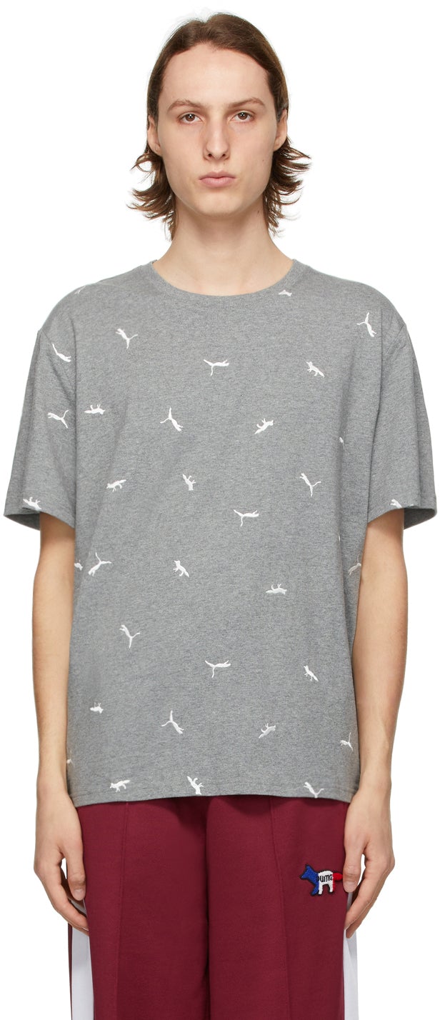 Short sleeve cotton jersey T-shirt in grey. Logo pattern embroidered in white throughout. Rib knit crewneck collar. Tonal textile logo patch at hem. Part of the Maison Kitsuné x Puma collaboration. Available exclusively at SSENSE. Supplier color: Medium grey Body: 100% cotton. Trim: 95% cotton, 5% elastane. Brand: Maison Kitsuné