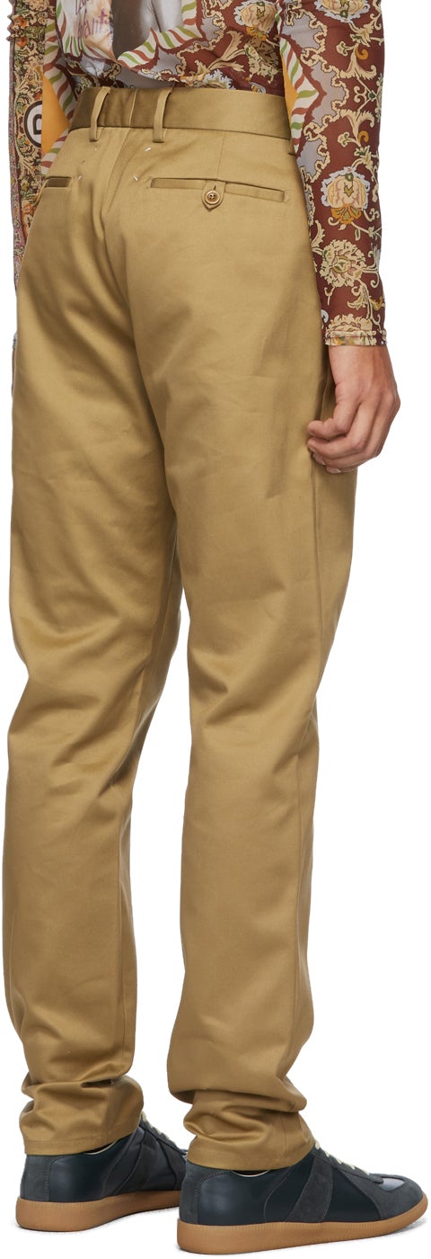 Straight-leg mercerized cotton gabardine trousers in beige. Mid-rise. Four-pocket styling. Belt loops at waistband. Signature stitching in white at back. Button-fly. Tonal and silver-tone hardware. Supplier color: Khaki 100% cotton. Brand: Maison Margiela