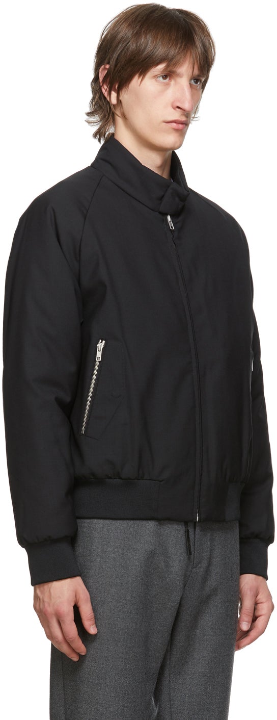 Long sleeve insulated cotton-blend canvas bomber jacket in black. Stand collar featuring concealed button closure. Zip-closure at front. Welt pockets at waist. Elasticized rib knit cuffs and hem. Signature stitching in white at back. Patch pocket and textile logo patch at interior. Fully lined. Silver-tone hardware. Supplier color: Black Body: 65% polyester, 35% cotton. Trim: 100% viscose. Lining: 100% polyester. Fill: 100% polyester. Brand: Maison Margiela