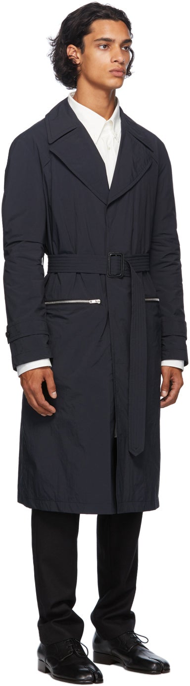 Packable long sleeve recycled nylon taffeta trench coat in black. Notched lapel collar. Concealed button closure at front. Zippered pockets at waist featuring integrated stowaway zippered pouch with logo patch and partially detachable shoulder strap. Buttoned tab at cuffs. Signature stitching in white and storm flap at back. Central vent at back hem. Patch pocket at interior. Silver-tone hardware. Supplier color: Black Body: 100% polyamide. Trim: 100% polyurethane. Brand: Maison Margiela