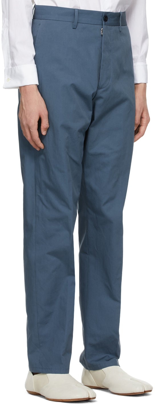 Straight-leg cotton canvas trousers in blue. High-rise. Four-pocket styling. Belt loops at waistband. Central creases at front and back. Signature white stitching at back waistband. Button-fly. Black hardware. Supplier color: Slate blue 100% cotton. Brand: Maison Margiela