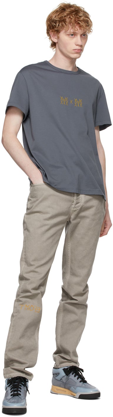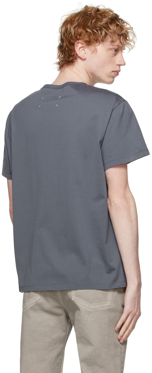 Short sleeve cotton jersey T-shirt in blue. Rib knit crewneck collar. Logo embroidered in yellow at chest. Signature white stitching at back. Supplier color: Steel blue 100% cotton. Brand: Maison Margiela