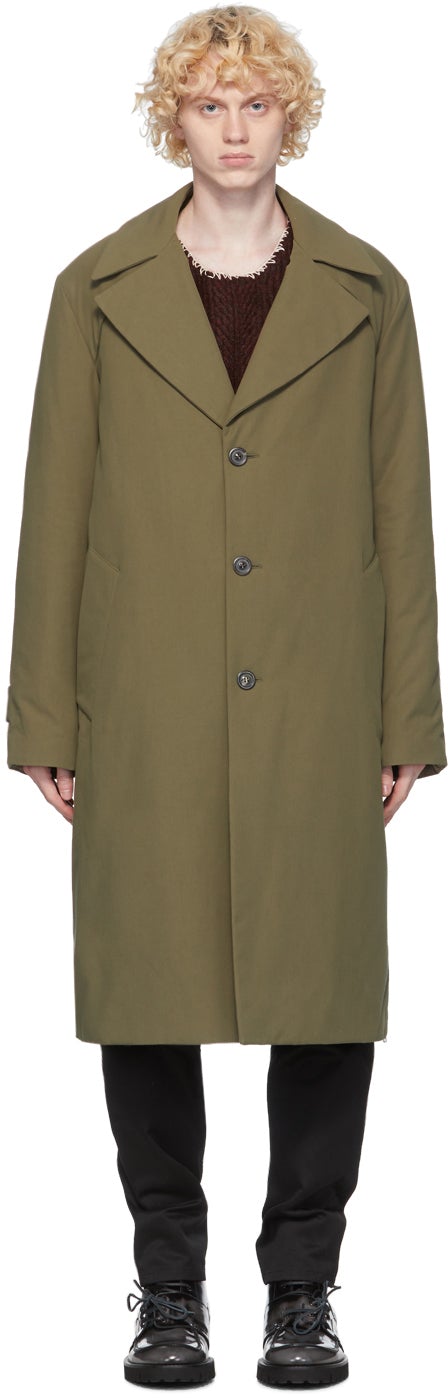 Long sleeve insulated cotton twill trench coat in green. Notched lapel collar. Button closure at front. Pleats at chest. Welt pockets at waist. Button tab at cuffs. Signature white stitching at back. Zippered vents at back hem. Patch pockets at interior. Fully lined. Silver-tone hardware. Supplier color: Dark olive Body: 100% cotton. Padding: 100% polyester. Lining: 100% nylon. Brand: Maison Margiela