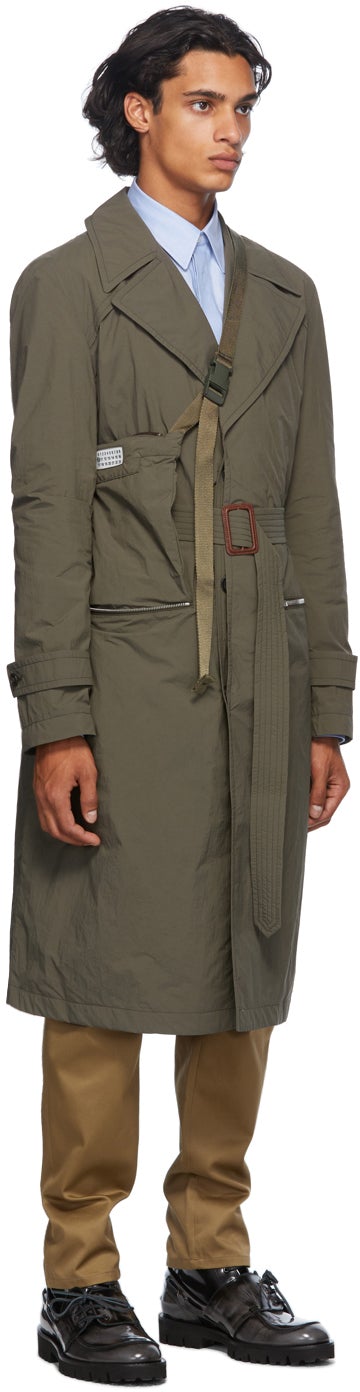 Packable long sleeve recycled nylon taffeta trench coat in green. Notched lapel collar. Concealed button closure at front. Zippered pockets at waist featuring integrated stowaway zippered pouch with logo patch and partially detachable shoulder strap. Buttoned tab at cuffs. Signature stitching in white and storm flap at back. Central vent at back hem. Patch pocket at interior. Silver-tone hardware. Supplier color: Military green Body: 100% polyamide. Trim: 100% polyurethane. Brand: Maison Margiela