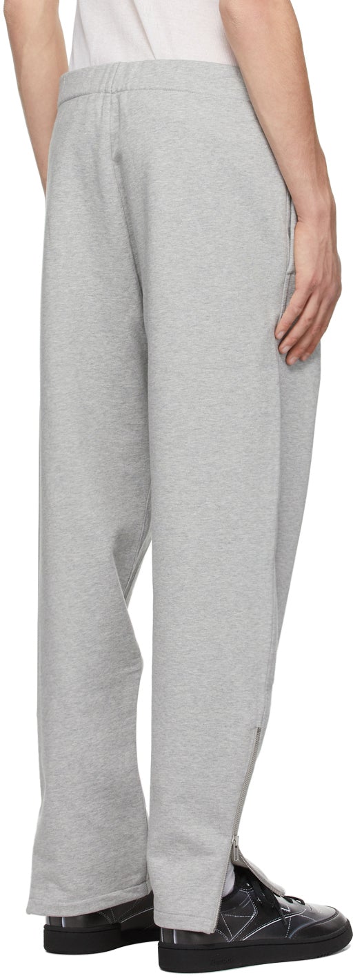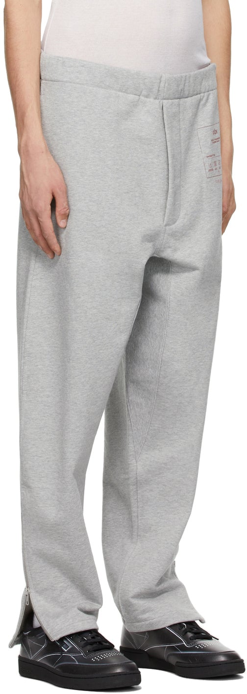 Tapered French terry lounge pants in grey mélange. Mid-rise. Two-pocket styling. Concealed drawstring at elasticized waistband. Graphic printed in burgundy at front. Zippered vent at cuffs. Signature white stitching at back waistband. Mock-fly. Silver-tone hardware. Supplier color: Grey mélange 100% cotton. Brand: Maison Margiela