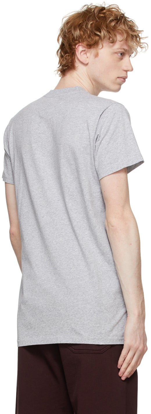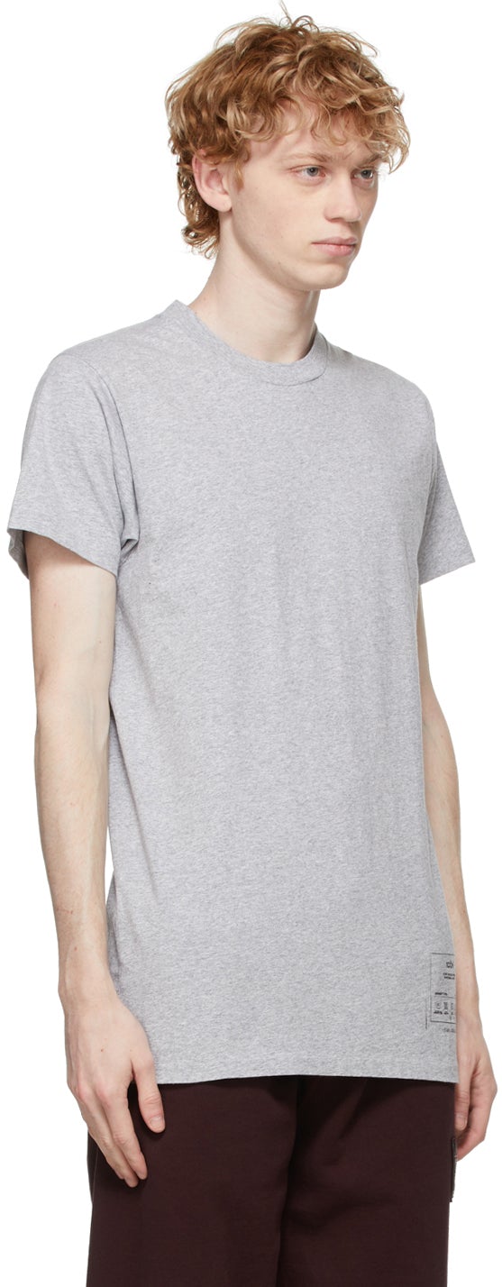 Short sleeve cotton jersey T-shirt in heather grey. Rib knit crewneck collar. Text and graphic printed in black at front hem. Signature white stitching at back collar. Supplier color: Grey melange 100% cotton. Brand: Maison Margiela