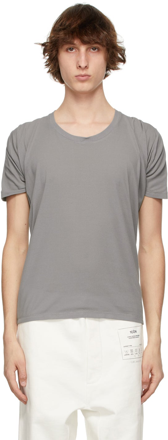 Short sleeve cotton crêpe T-shirt in grey. Gathering throughout. Rib knit crewneck collar. Signature white stitching at back. Supplier color: Storm 100% cotton. Brand: Maison Margiela