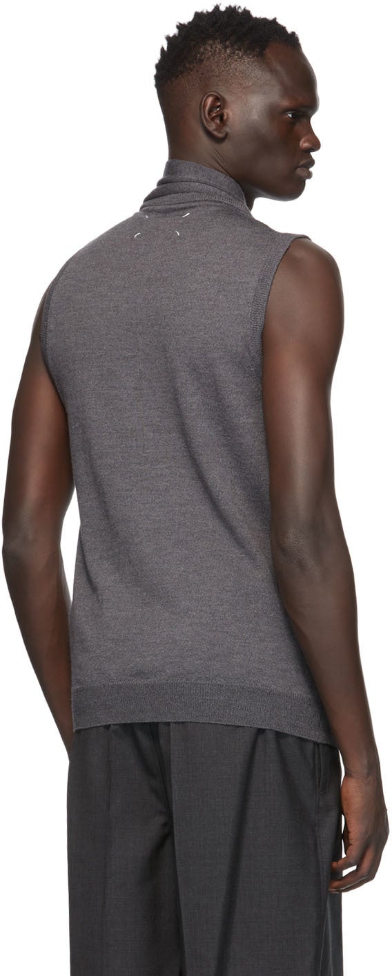 Sleeveless 12 gauge knit wool vest in grey. Integrated scarf at rib knit V-neck collar. Rib knit armscyes and hem. Signature stitching in white at back. Supplier color: Dark grey 100% wool. Brand: Maison Margiela