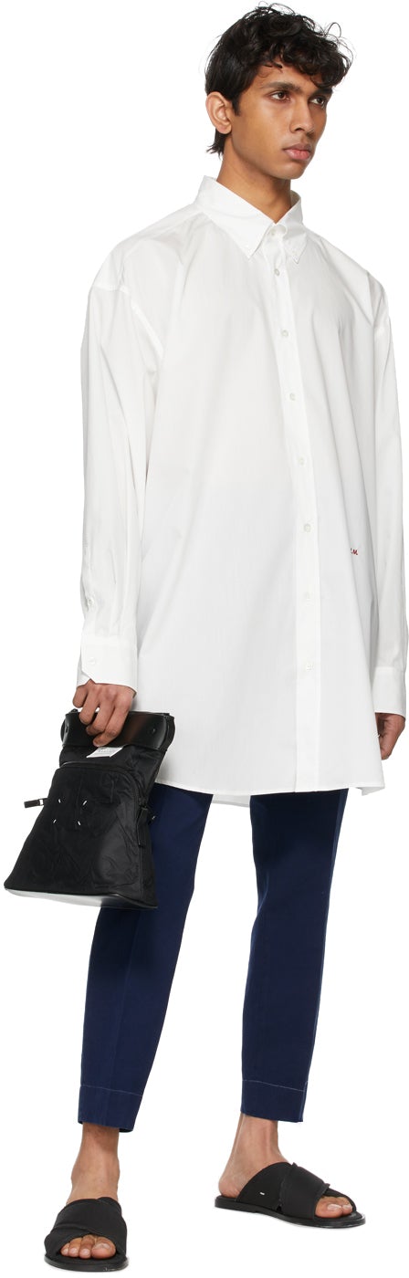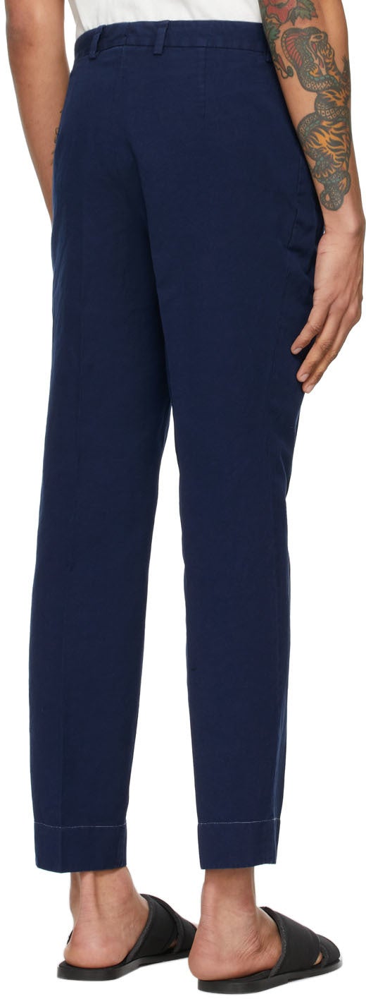 Tapered cotton and linen-blend canvas trousers in indigo. Mid-rise. Two-pocket styling. Belt loops at waistband. Central crease at front and back. Signature stitching in white at back waistband. Contrast stitching in white at cuffs. Zip-fly. Silver-tone hardware. Supplier color: Indigo 62% cotton, 38% linen. Brand: Maison Margiela