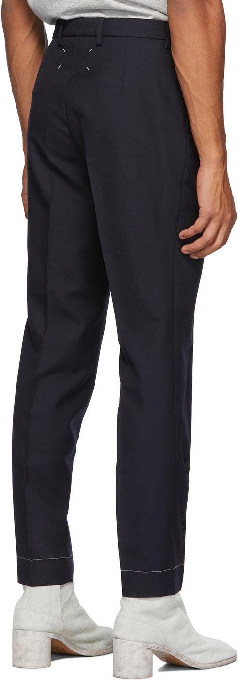 Regular-fit wool-blend twill trousers in navy. Mid-rise. Two-pocket styling. Belt loops at waistband. Central creases at front and back. Topstitching in white at cuffs. Signature stitching in white at back. Partially lined. Zip-fly. Silver-tone hardware. Supplier color: Navy Body: 55% polyester, 45% wool. Lining: 100% viscose. Brand: Maison Margiela