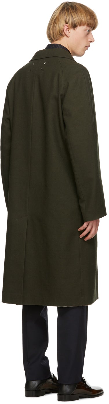 Reversible long sleeve wool and cotton-blend twill coat in green. Wool trim with multicolor check pattern at notched lapel collar. Button closure at front. Welt pockets at waist. Raglan sleeves. Signature white stitching at back collar. Central vent at back hem. Fully lined. Black hardware. Reverse in beige wool twill featuring check pattern in tones of brown, black, and white throughout. Wool-blend trim in green at notched lapel collar. Button closure at front. Welt pockets at waist. Raglan sleeves. Signature white stitching at back collar. Central vent at back hem. Fully lined. Black hardware. Supplier color: Olive Body 1: 50% wool, 50% cotton. Body 2: 100% wool. Lining: 100% cotton. Brand: Maison Margiela