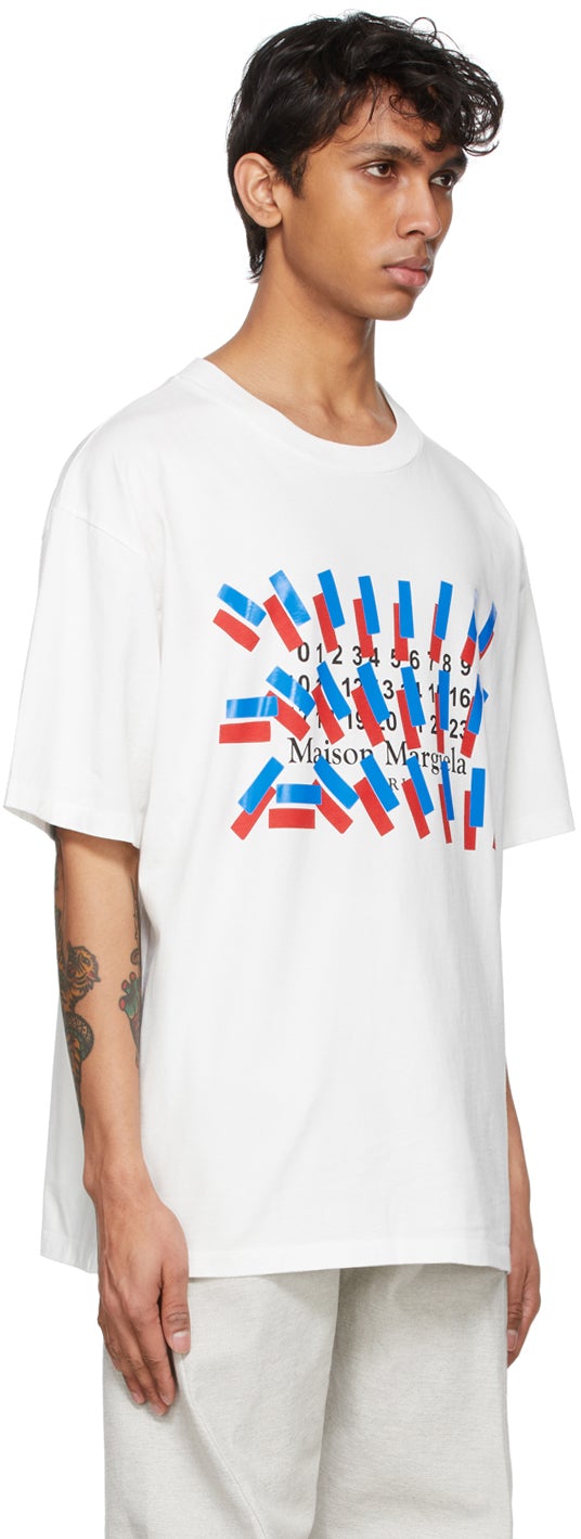 Short sleeve cotton jersey T-shirt in white. Rib knit crewneck collar. Logo printed in black and graphic bonded in red and blue at front. Signature white stitching at back collar. Supplier color: Off-white 100% cotton. Brand: Maison Margiela