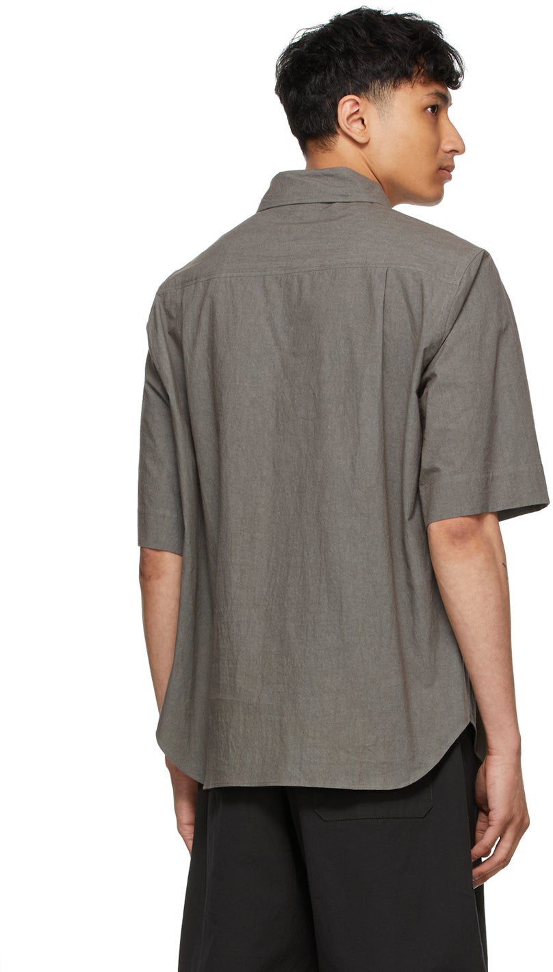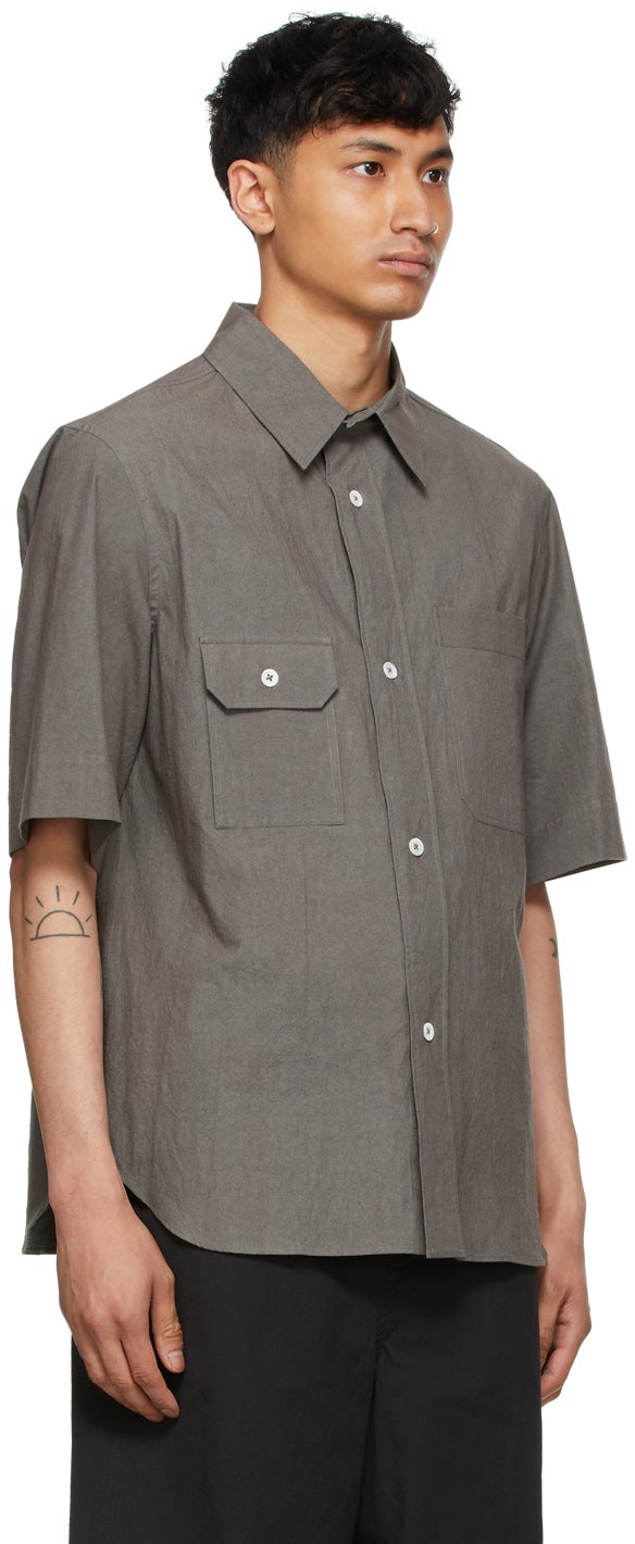 Short sleeve brushed cotton poplin shirt in grey. Fading throughout. Spread collar. Button closure at front. Patch pocket and flap pocket at chest. Box pleat at back yoke. Shirttail hem. Supplier color: Olive leaf 100% cotton. Brand: Margaret Howell