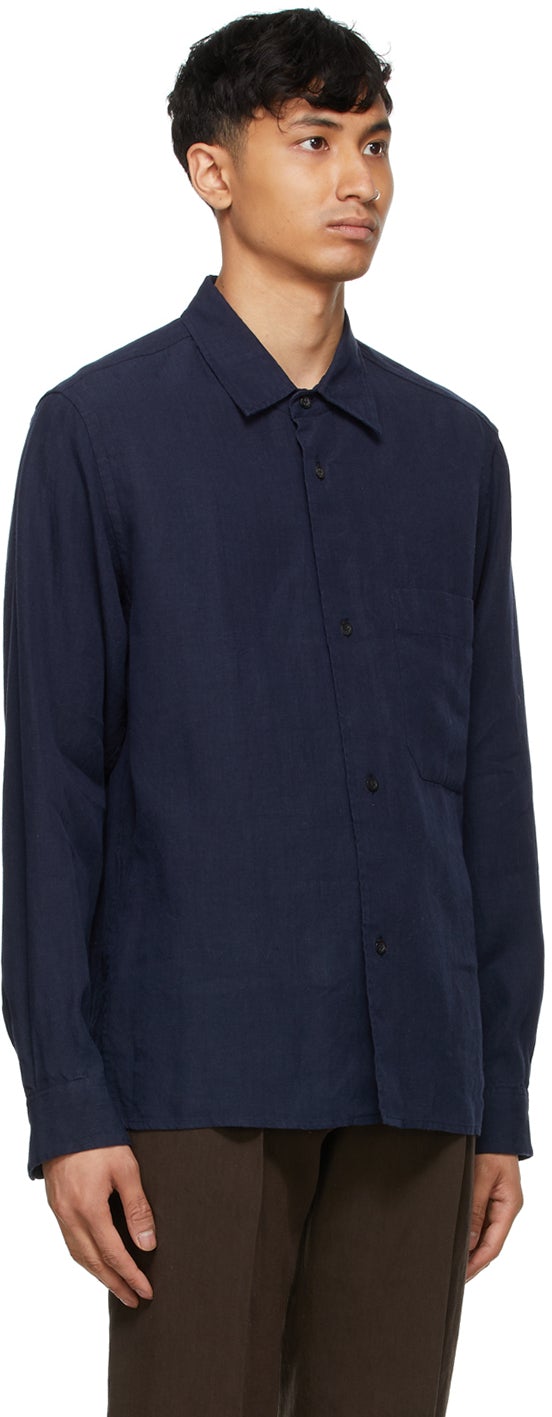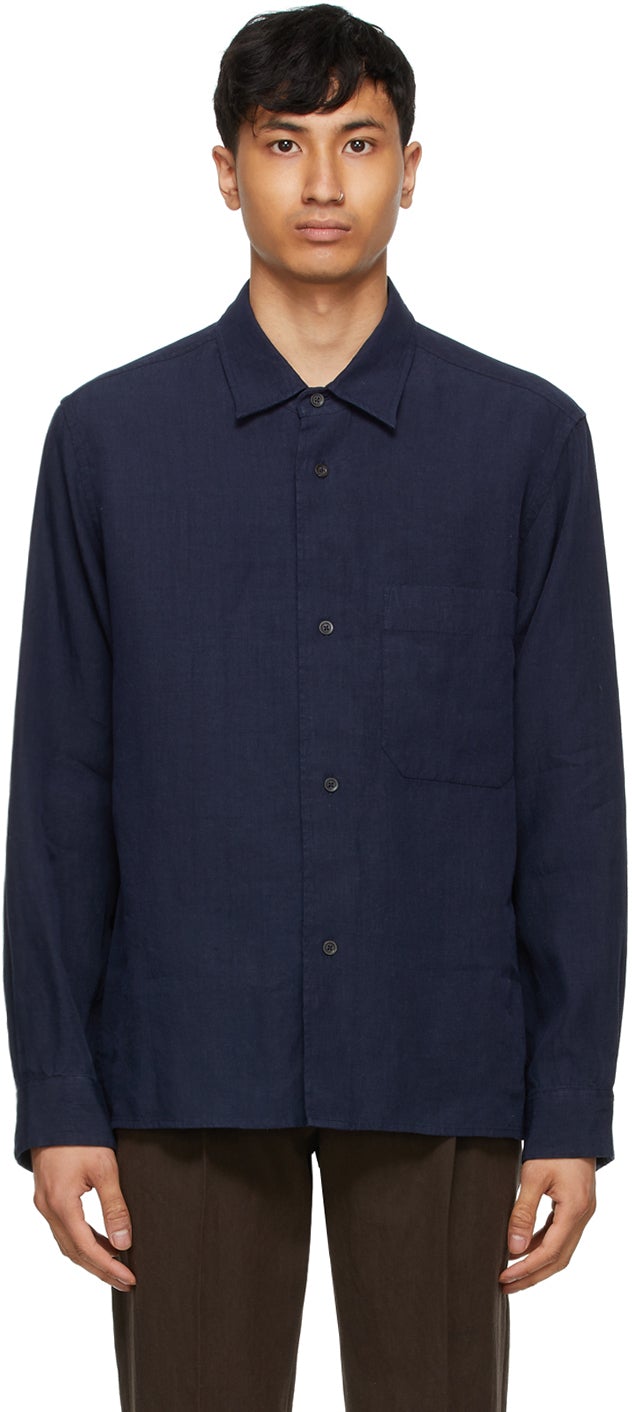Long sleeve plain woven linen shirt in indigo. Spread collar. Button closure at front. Patch pocket at chest. Single-button barrel cuffs. Gusset at side-seam. Supplier color: Indigo 100% linen. Brand: Margaret Howell