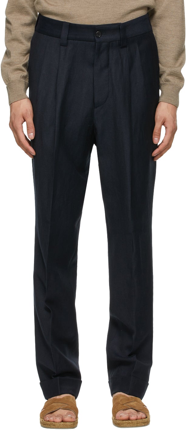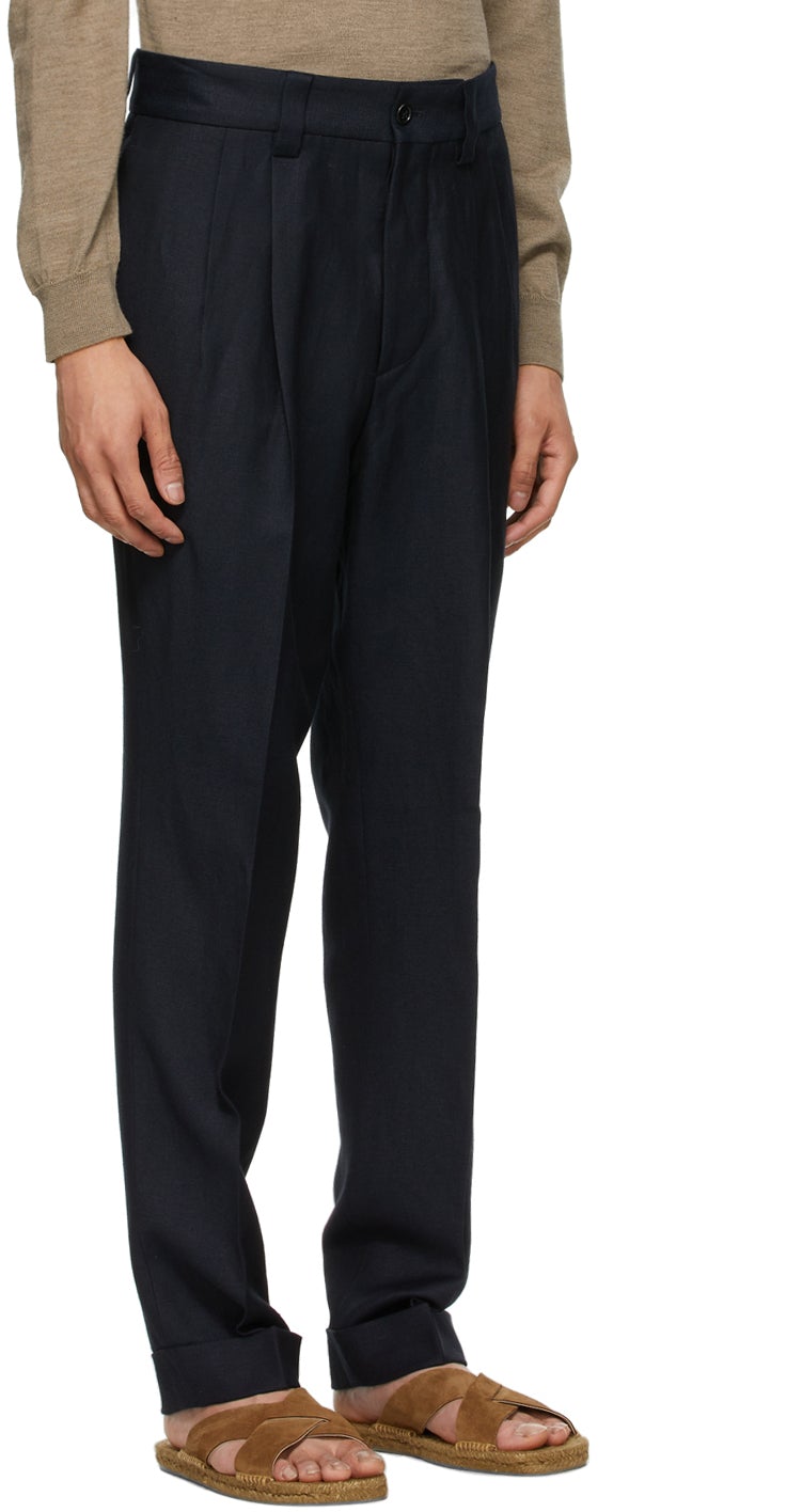 Tapered wool and linen-blend twill trousers in navy. Mid-rise. Four-pocket styling. Belt loops at waistband. Pleats at front waistband. Central crease at legs. Rolled cuffs. Button-fly. Black hardware. Supplier color: Midnight 51% wool, 49% linen. Brand: Margaret Howell