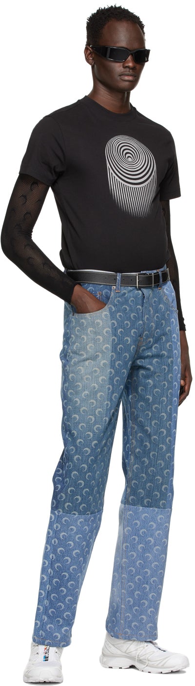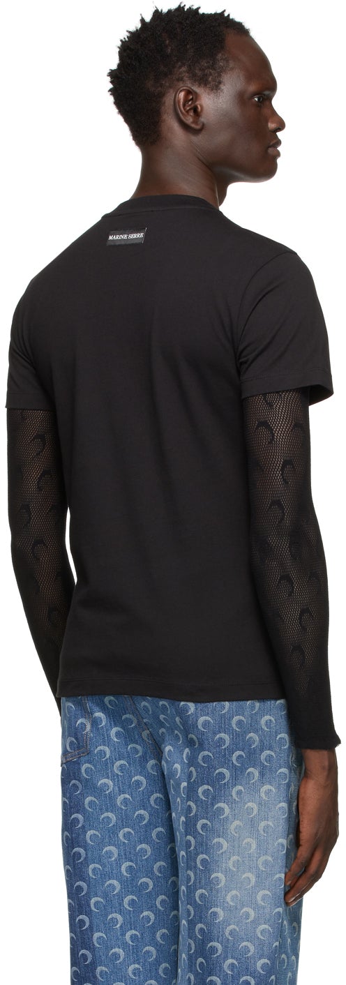 Short sleeve organic cotton jersey T-shirt in black. Rib knit crewneck collar. Logo graphic printed in silver-tone at front. Tonal textile logo patch at back collar. Supplier color: Black 100% organic cotton. Brand: Marine Serre