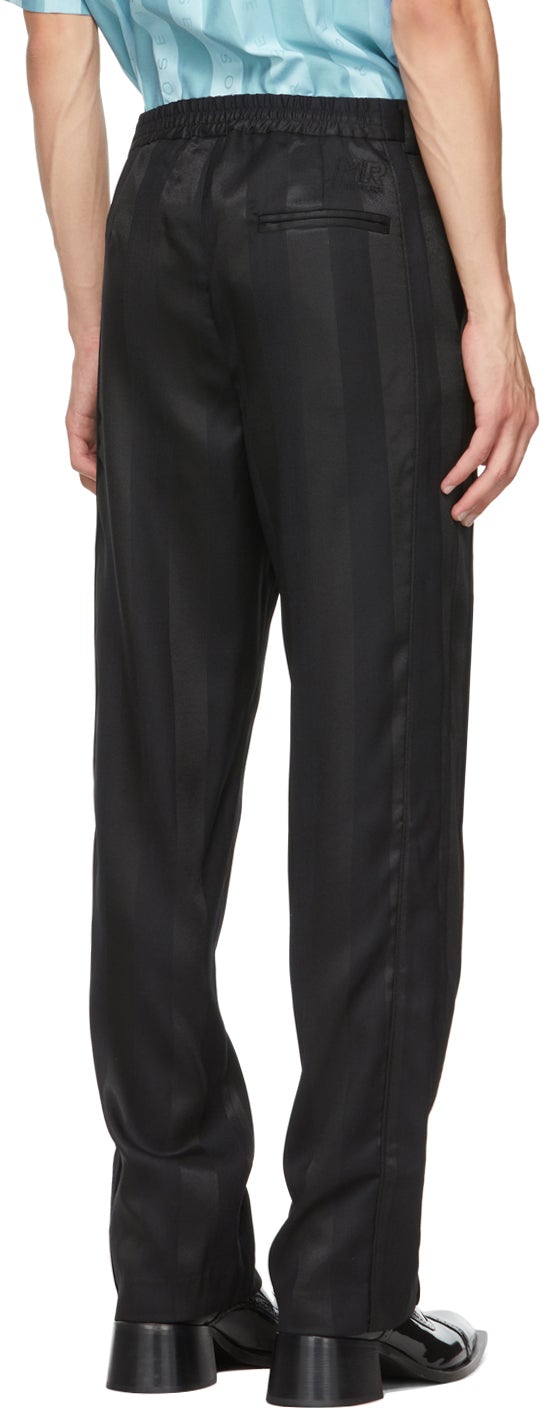 Relaxed-fit wool and viscose-blend twill trousers in black featuring tonal stripe pattern throughout. Mid-rise. Three-pocket styling. Belt loops at elasticized waistband. Textile logo patch in green, white, red at front. Tonal logo embroidered at back. Zip-fly. Tonal hardware. Supplier color: Black 68% virgin wool, 32% viscose. Brand: Martine Rose
