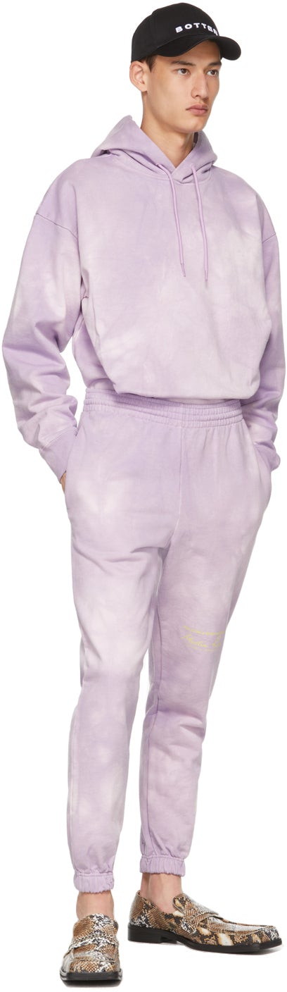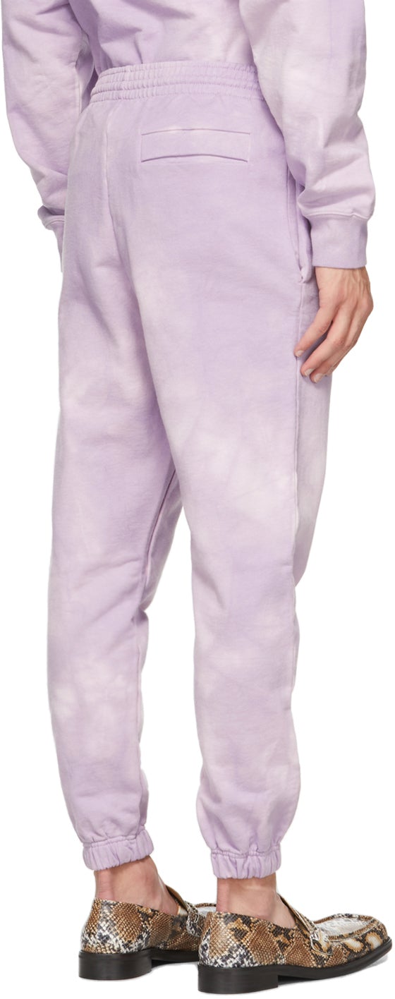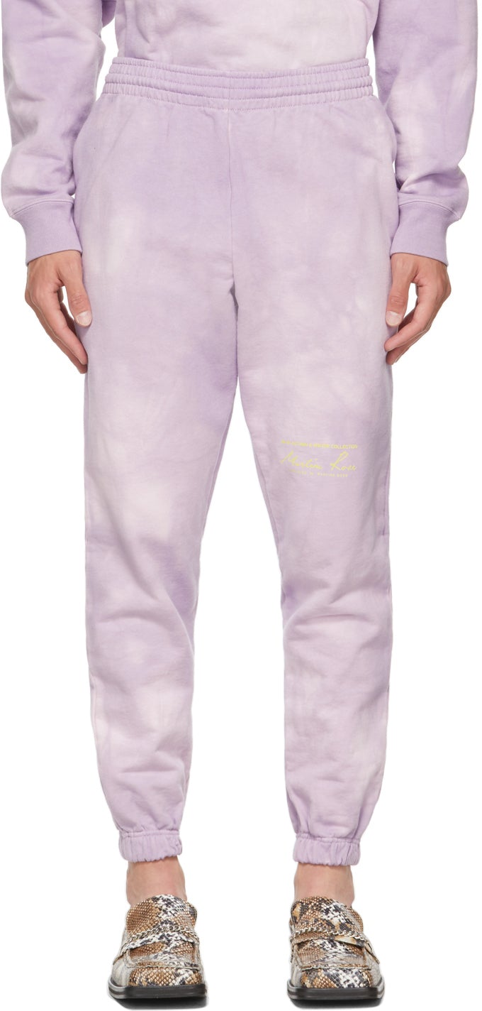 Tapered cotton jersey sweatpants in purple featuring tonal dyed pattern throughout. Mid-rise. Three-pocket styling. Tonal drawstring at elasticized waistband. Logo printed in yellow at front. Elasticized cuffs. Each item is unique. Please note that coloration may vary. Supplier color: Mauve 100% cotton. Brand: Martine Rose