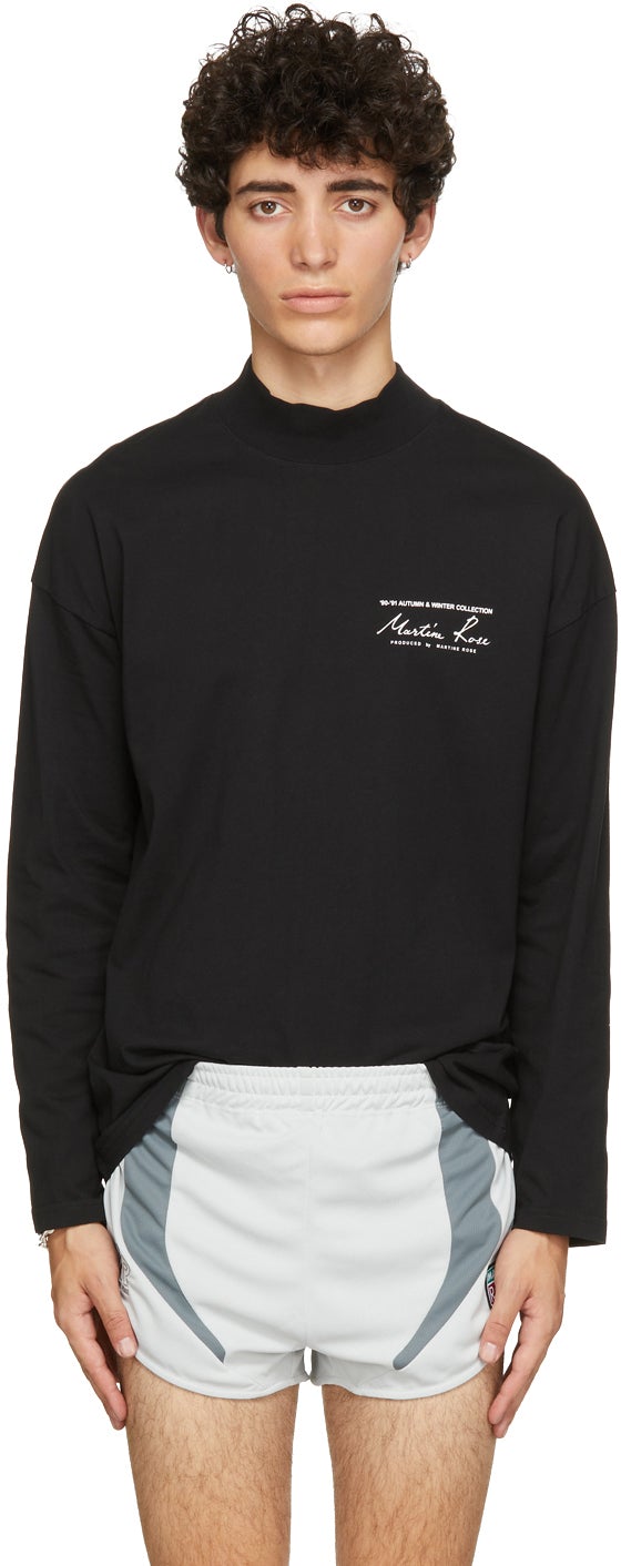 Long sleeve cotton jersey T-shirt in black. Rib knit mock neck collar. Logo printed in white at chest and back. Available exclusively at SSENSE. Supplier color: Black 100% cotton. Brand: Martine Rose