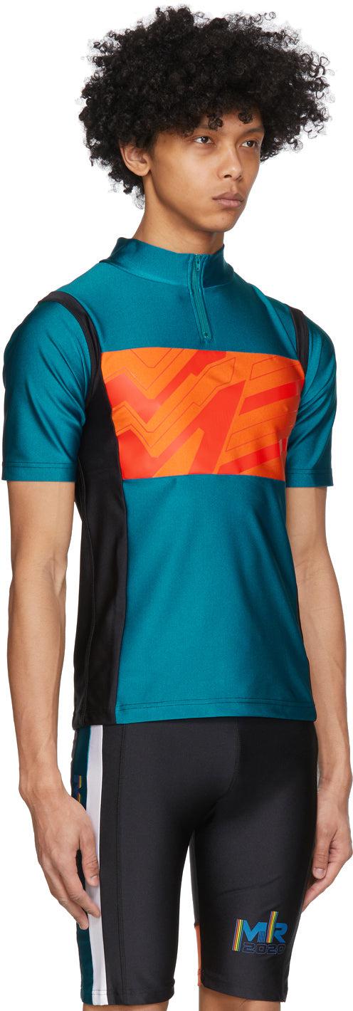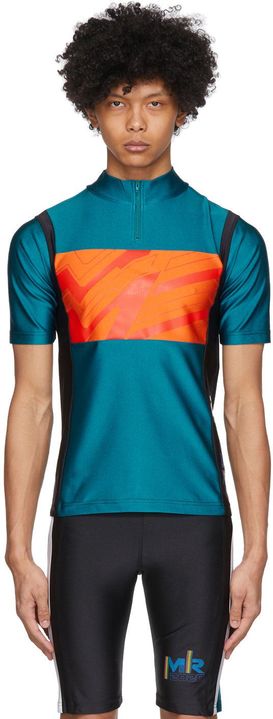 Short sleeve panelled stretch nylon jersey t-shirt colorblocked in green, orange, and black. Stand collar. Half-zip closure at front. Graphic printed in red at front and back. Logo printed at side-seam. Tonal hardware. Available exclusively at SSENSE. Supplier color: Jade matte 80% polyamide, 20% elastane. Brand: Martine Rose