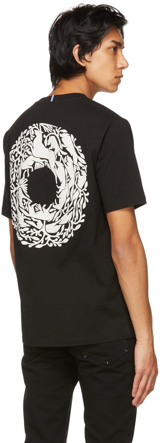Short sleeve cotton jersey T-shirt in black. Rib knit crewneck collar. Tonal logo appliqué at chest. Textile logo patch in purple and black at waist. Graphic bonded in white at back. Part of the Albion collection. Supplier color: Darkest black 100% cotton. Brand: MCQ