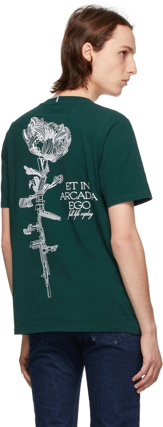 Short sleeve cotton jersey T-shirt in green. Rib knit crewneck collar. Text printed in white at chest. Textile logo patch in purple at front hem. Textile flag in purple at back collar. Text and graphic printed in white at back. Part of the Eden High collection. Supplier color: Varsity green Body: 100% cotton. Trim: 100% polyester. Brand: MCQ